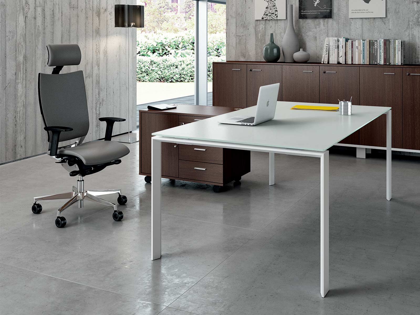 Le bureau haut de gamme Turing Nuca possède une silhouette légère grâce à son piètement fin et son plateau en verre. Cet ensemble s'intègre ainsi facilement dans les espaces de direction et dégagera une image qualitative pour votre entreprise.