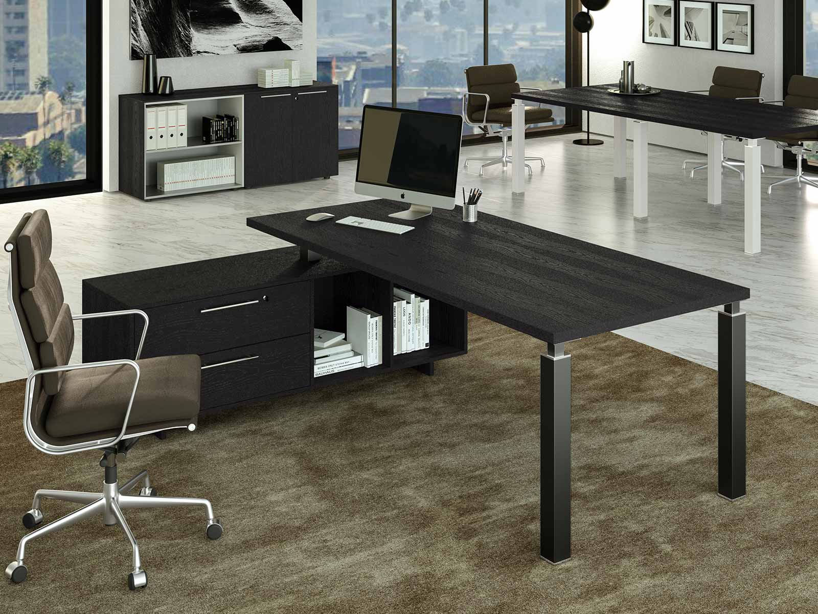 Le plan du bureau est composé de bois mélaminé avec chant antichoc en ABS 3 mm. Le voile de fond (panneau qui cache l'espace sous le bureau à vos visiteurs) fait 18 mm d'épaisseur. Le plan repose sur des pieds en acier via des platines, section 70x70 mm sur la partie principale, et 40x40 mm sur la partie supérieure, disponible en noir mat (RAL 9005) ou en blanc brillant (RAL 9010).