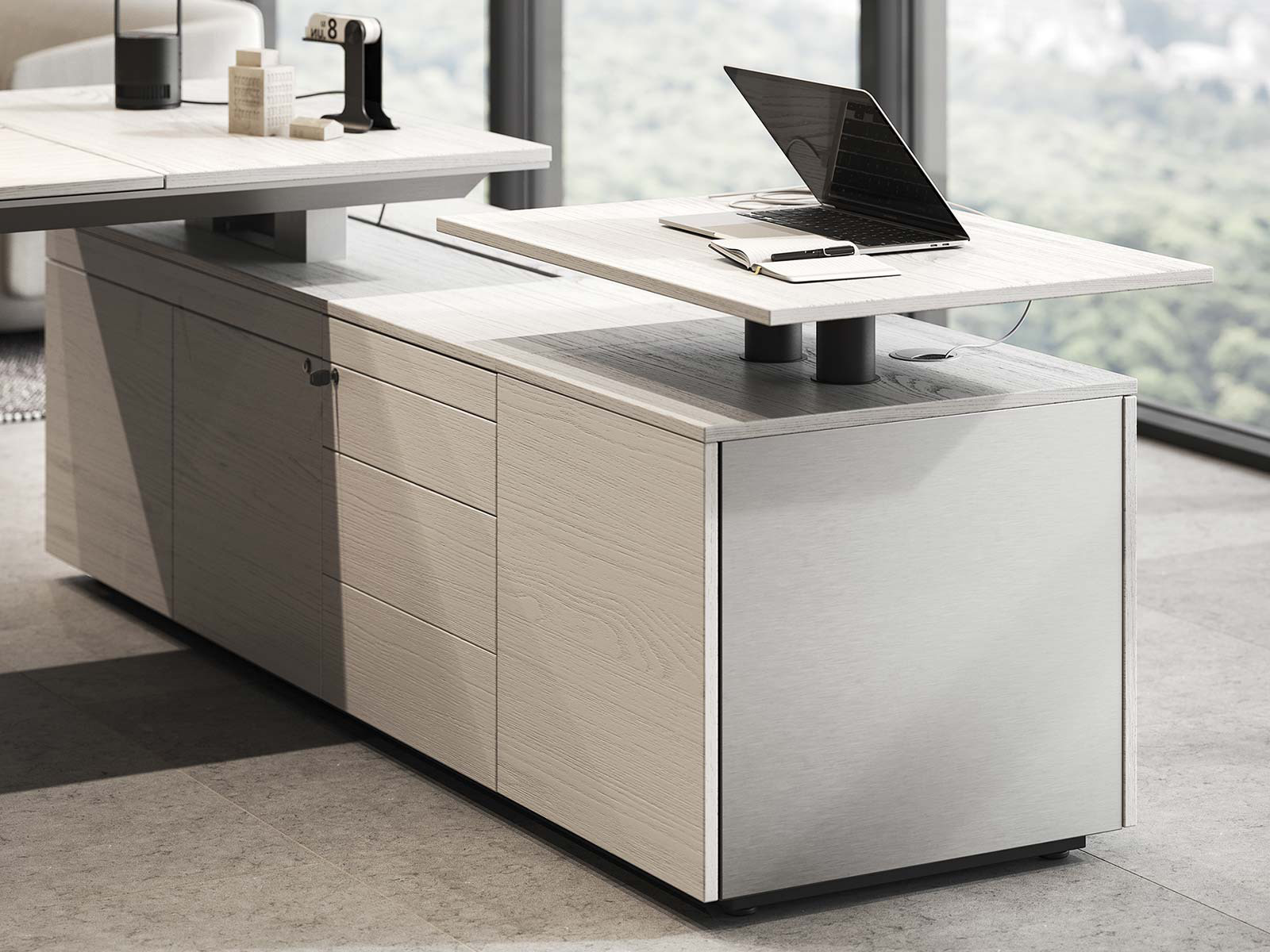 Le bureau de direction Ono 4X, dans sa configuration sur crédence, incarne une approche contemporaine du mobilier de direction haut de gamme. Avec sa finition en placage bois noble, ses lignes tendues et son équilibre subtil entre technicité et esthétique, ce bureau reflète un univers professionnel d’élite où le design rime avec performance. Disponible en plusieurs largeurs avec une profondeur constante de 100 cm, et une position de retour à droite ou à gauche, ce modèle s’adapte parfaitement à vos exigences fonctionnelles comme stylistiques.