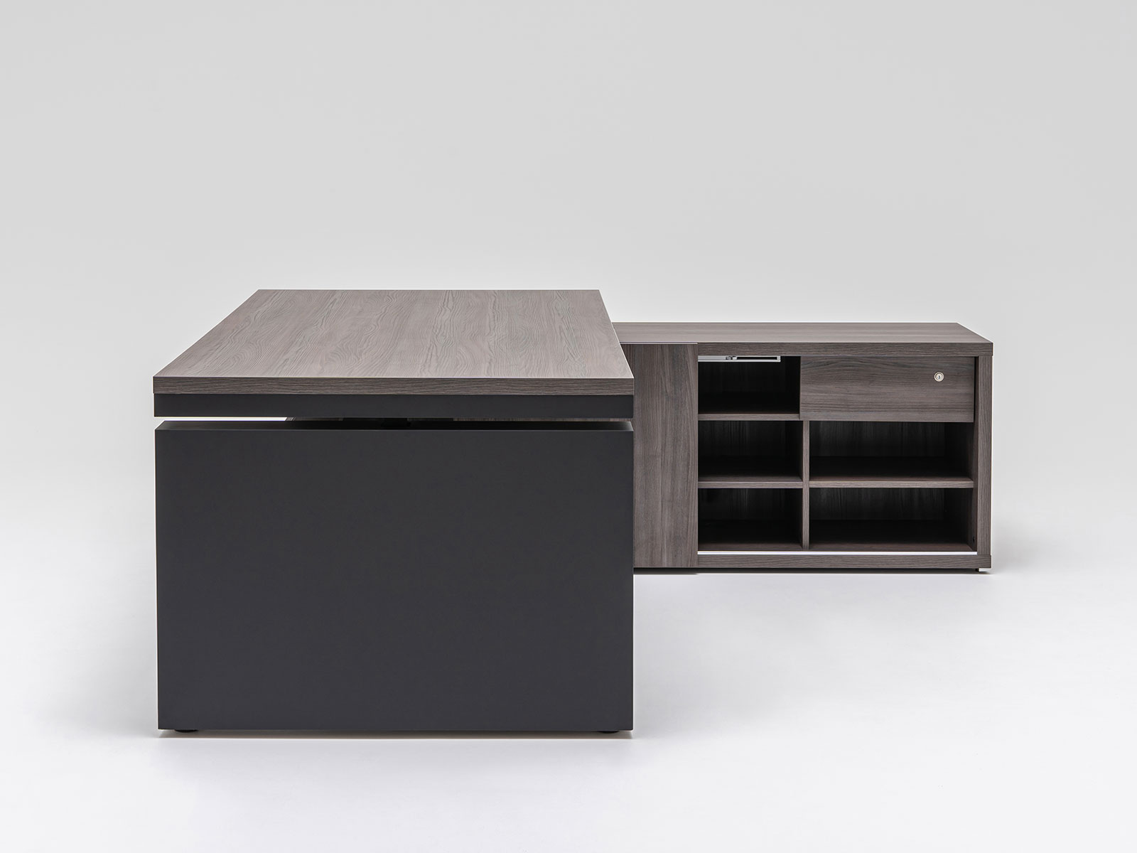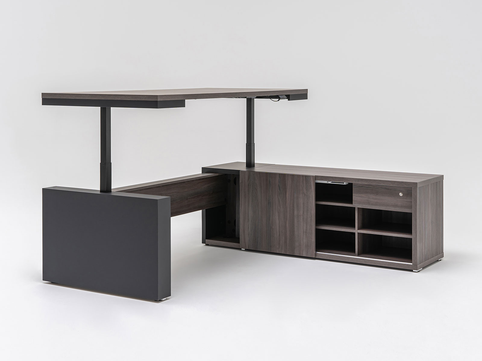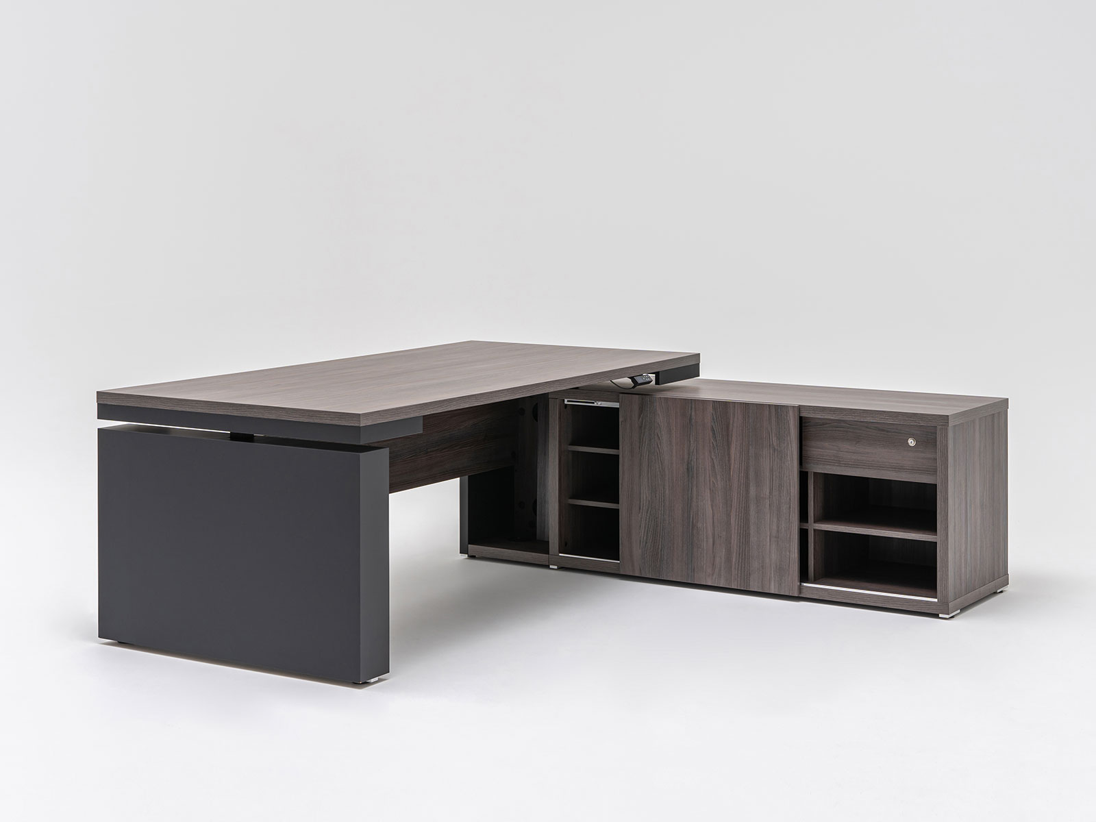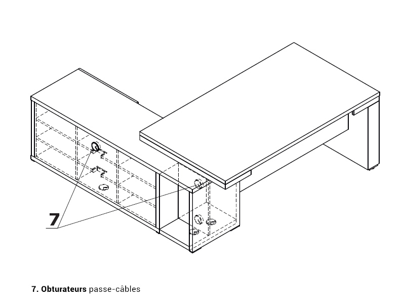 Ce bureau de direction fait parti des rares modèles de bureau exécutif disposant à la fois d'un réglage en hauteur électrique de son plan de travail ainsi qu'une crédence de rangement. Cette dernière comprend 8 niveaux de rangements semi-fermés par une porte coulissante et 1 niveau comprenant un tiroir avec serrure. Elle comprend également de nombreux obturateurs passe-câbles pour vous permettre de configurer aisément l'électrification du bureau, notamment avec l'option Médiabox.