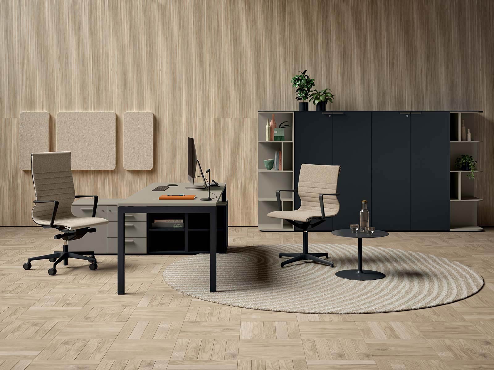 designers Gianantonio Perin et Giorgio Topan, il se distingue par des lignes sobres et contemporaines qui valorisent l’espace de travail tout en affirmant une identité professionnelle forte. Sa