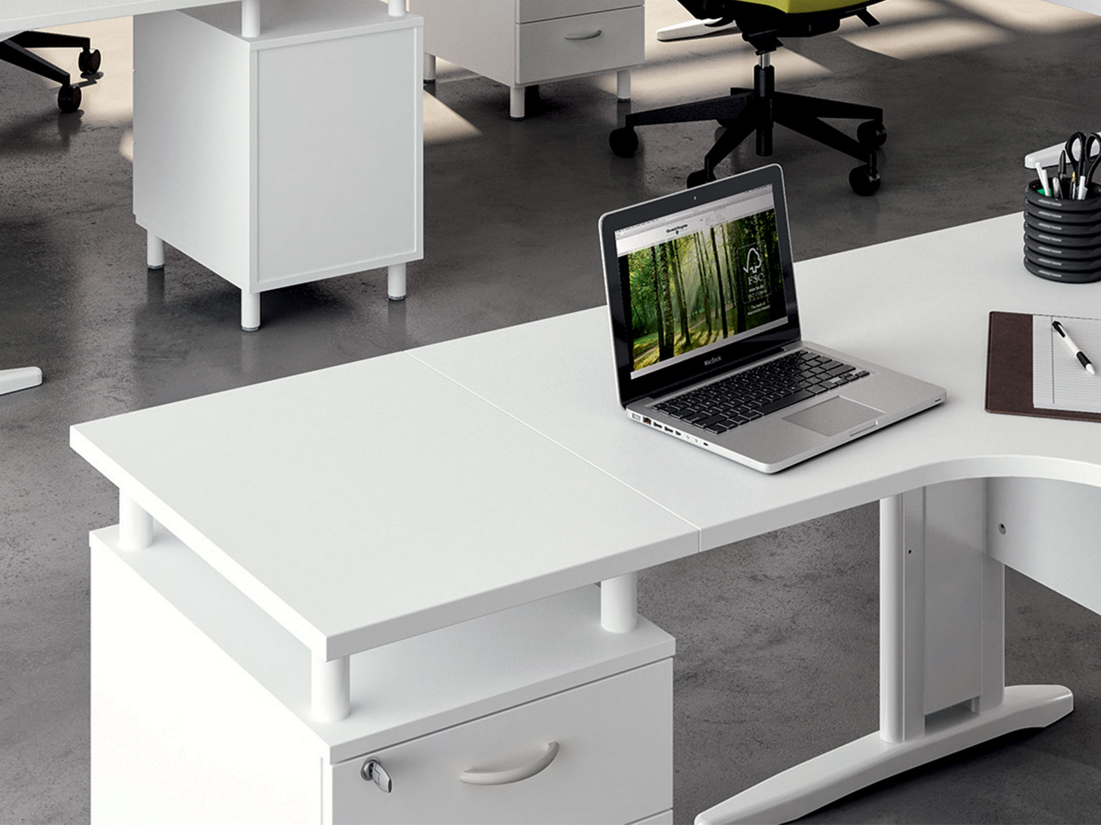 A noter qu'Etner propose toute une gamme de rangements assortis pour compléter ses bureaux. Le voile de fond et la descente des câbles dans le piètement sont inclus.