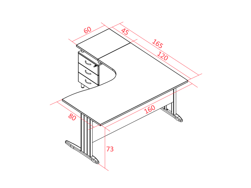 Le plateau en mélaminé d'une épaisseur de 25 mm se situe à 73 cm de haut et mesure 160 cm de long. La profondeur avec le retour compris est de 165 cm. Le caisson possède 3 tiroirs dont un avec serrure pour ranger ses effets personnels notamment.