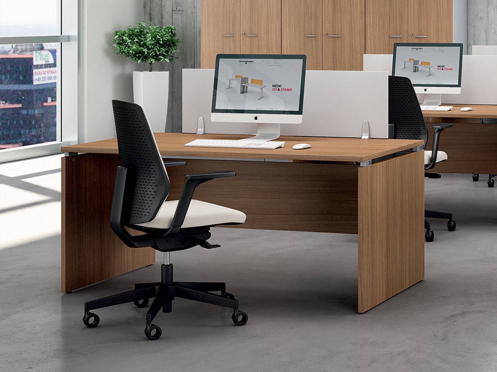 L'Okly Umo est un bureau individuel simple et abordable pour les entreprises. Il se distingue par son plan de travail mis en valeur en étant légèrement surélevé par rapport aux pieds.