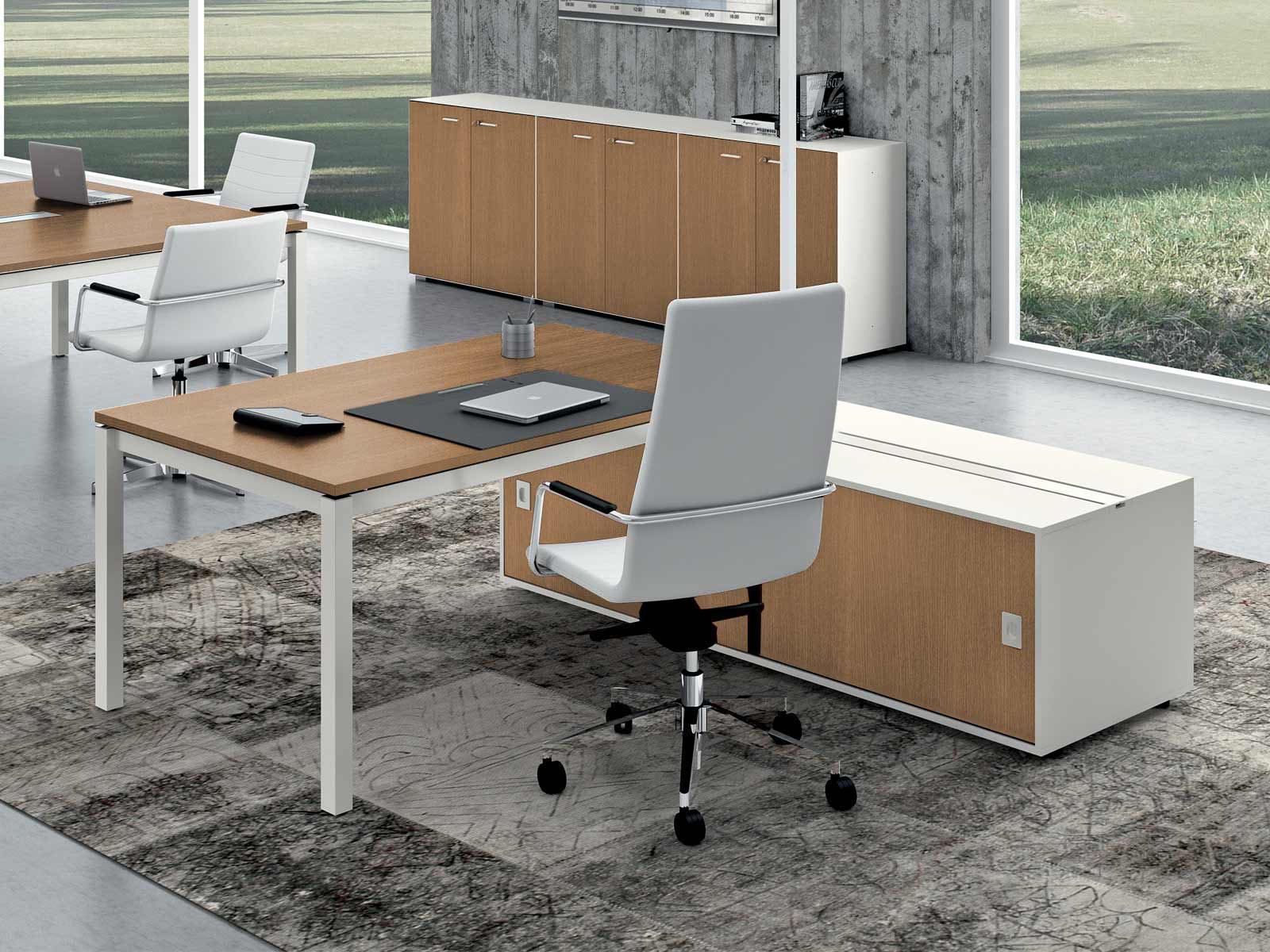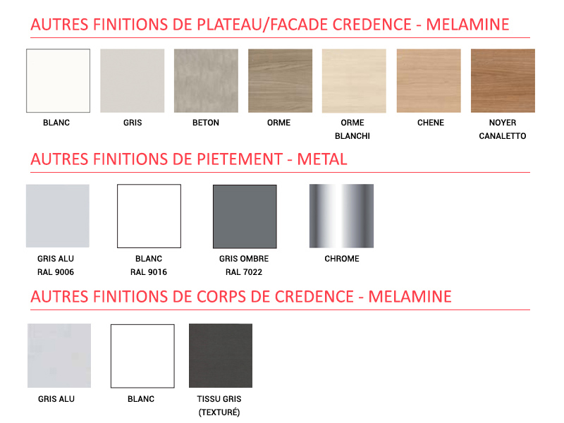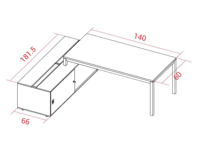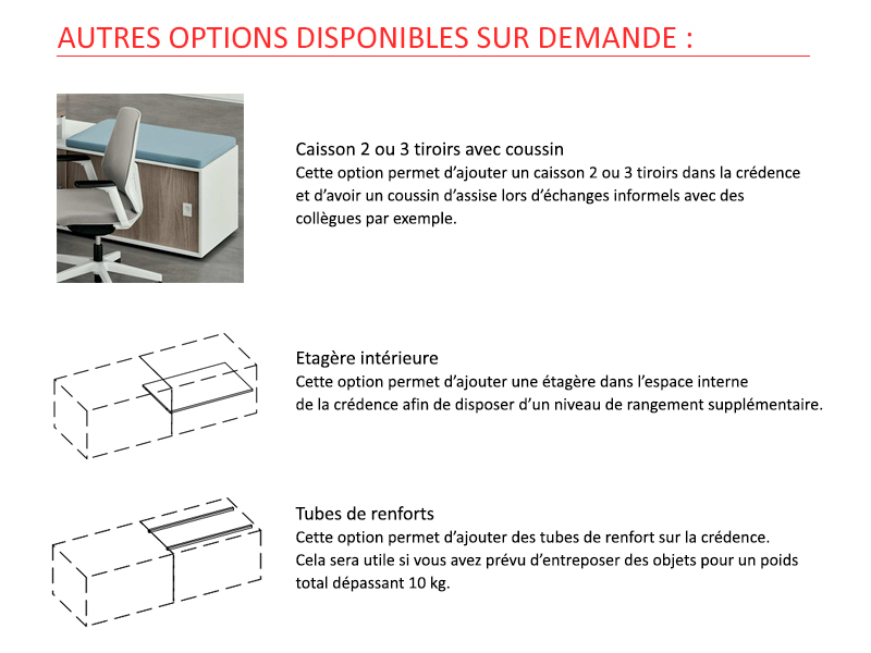 Le plateau en bois mélaminé d'épaisseur 25 mm est situé à une hauteur de 73 cm. Il est décliné en 3 largeurs : 140, 160 et 180 cm et 2 profondeurs : 60 ou 80 cm. La crédence en bois mélaminé d'épaisseur 18 mm propose un vaste espace de rangement à portée de main. Elle mesure 182 cm de large et 66 cm de profondeur.