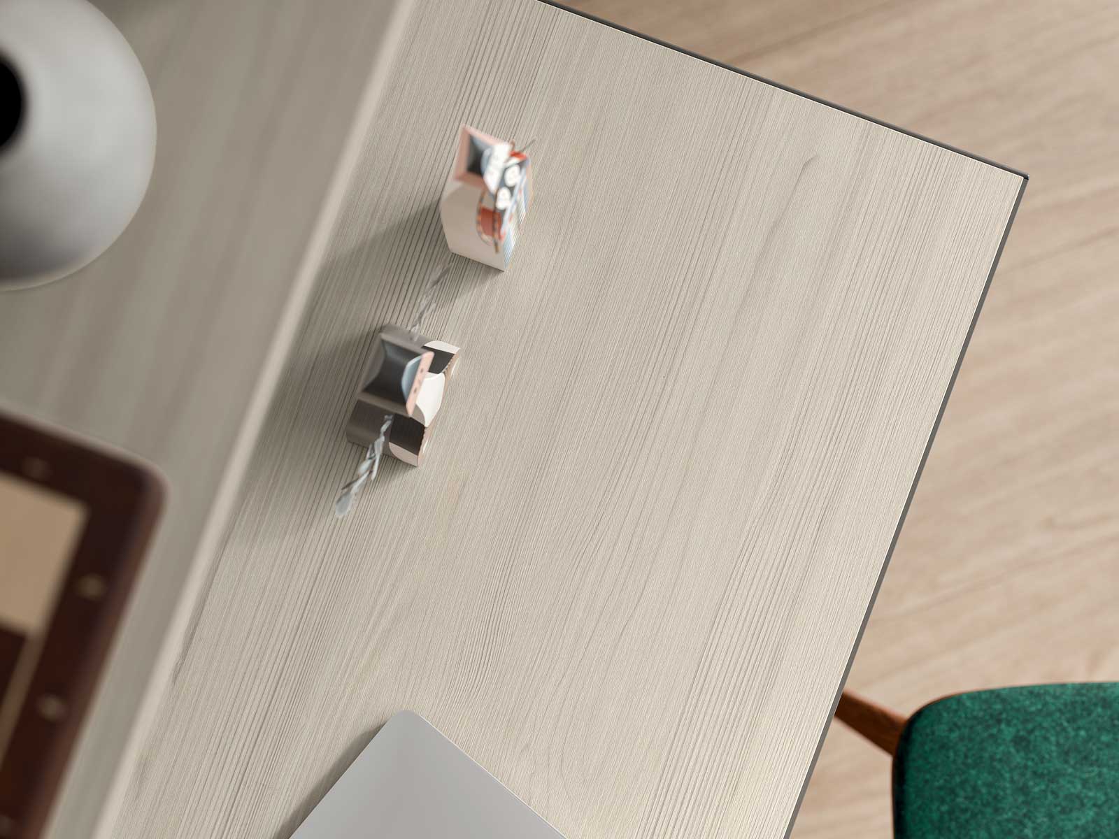 Le plan de travail est proposé en 7 finitions : blanc, gris, béton, chêne, wengé, noyer canaletto et orme. Les 5 dernières sont texturées.