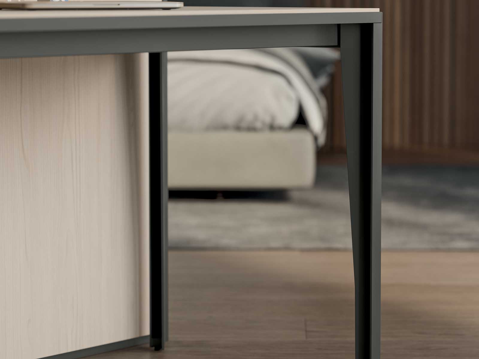 Le bureau individuel Oméga dispose d'une large surface de travail ainsi que d'une structure métallique travaillée dans laquelle vient s'encastrer un plateau en mélaminé pour une esthétique fine toute en élégance.