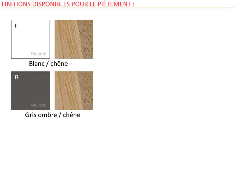 Le piètement du bureau est composé de métal et de bois. La partie supérieure est en acier vernis de coloris blanc ou gris ombre, au choix. La partie inférieure est en bois de frêne séché et vernis effet chêne. De forme A, le pied a une section losange de 32x32 cm en partie haute et 23x23 en partie basse. Il est équipé de vérins de réglage articulés en nylon et acier réglables de 0 à 25 mm. Le pied blanc a des vérins blanc, le pied ombre des vérins noirs.
