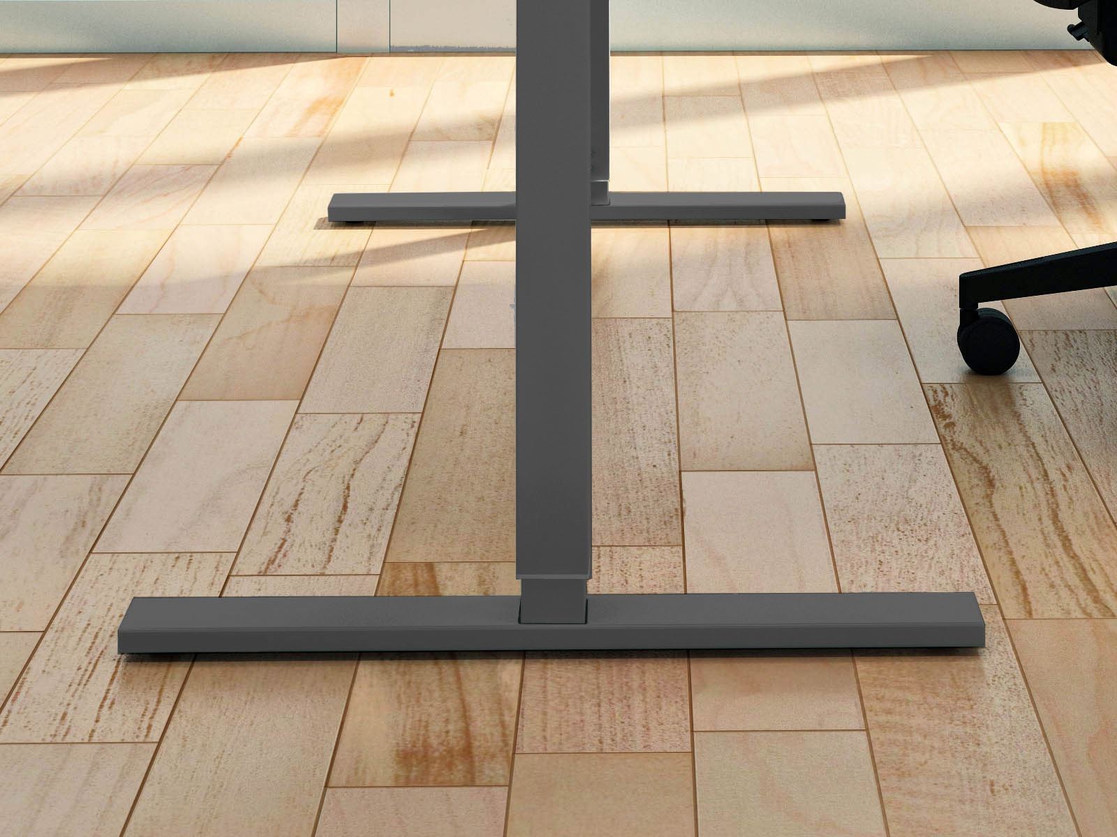 La gamme Alérion se démarque par la simplicité de ses lignes et se positionne en alternative au pied arche. Son piètement en T très esthétique intègre par défaut une descente de câbles qui permet de guider ces derniers vers le sol.