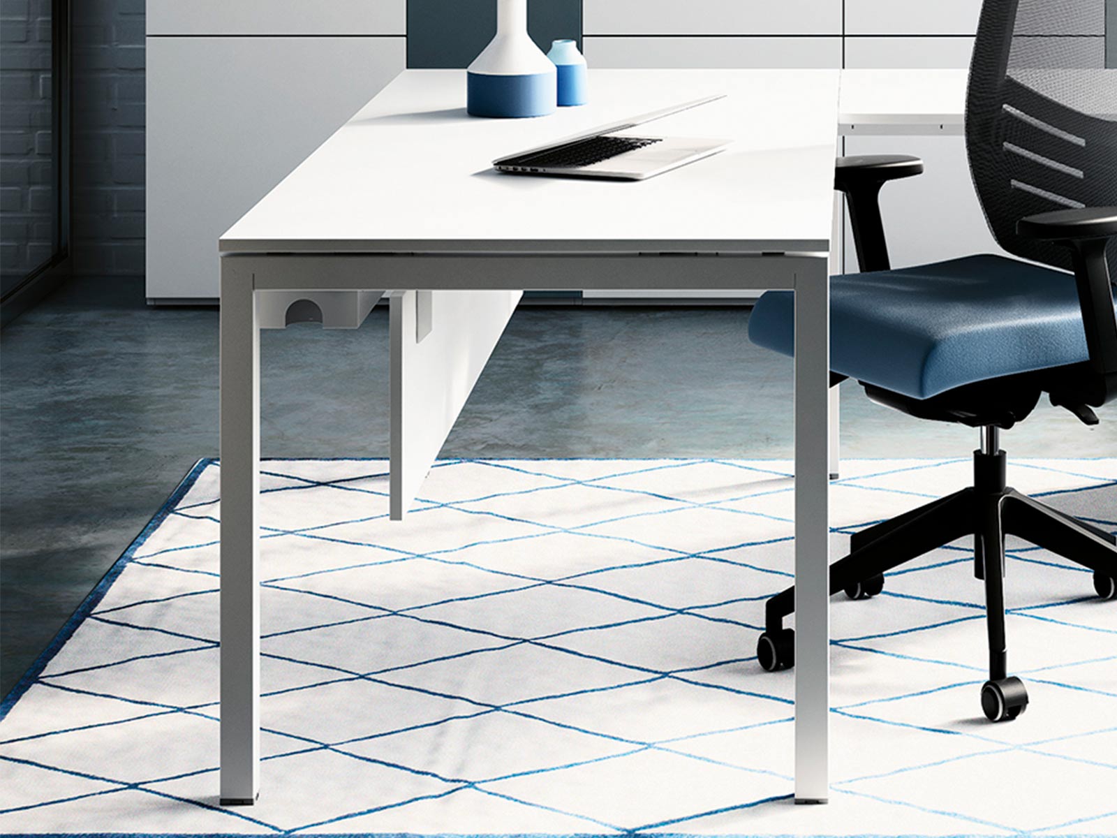 Son plateau est en bois mélaminé d'une épaisseur de 18 mm. Il est disponible en plusieurs finitions : blanc, chêne clair, noyer américain, orme et gris taupe. Ses pieds sont disponibles en blanc et en aluminium.