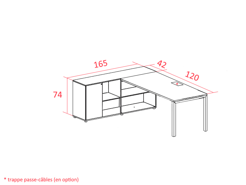 Cet ensemble de travail moderne et fonctionnel sera le choix idéal pour les utilisateurs à la recherche d'un poste tout en un. Cet ensemble comprend : un bureau disponible en 4 dimensions (120, 140, 160 et 180 cm de largeur pour 80 cm de profondeur) et son rangement de proximité très complet. Le meuble de rangement comprend un espace ouvert sur 2 niveaux, un espace fermé avec porte battante et un espace avec 3 tiroirs. Les espaces fermés disposent d'une serrure fourni avec son jeu de clés. Le meuble de rangement étant à la même hauteur que le bureau, il offrira une surface supplémentaire disponible d'une profondeur de 42 cm et d'une longueur de 165 cm.