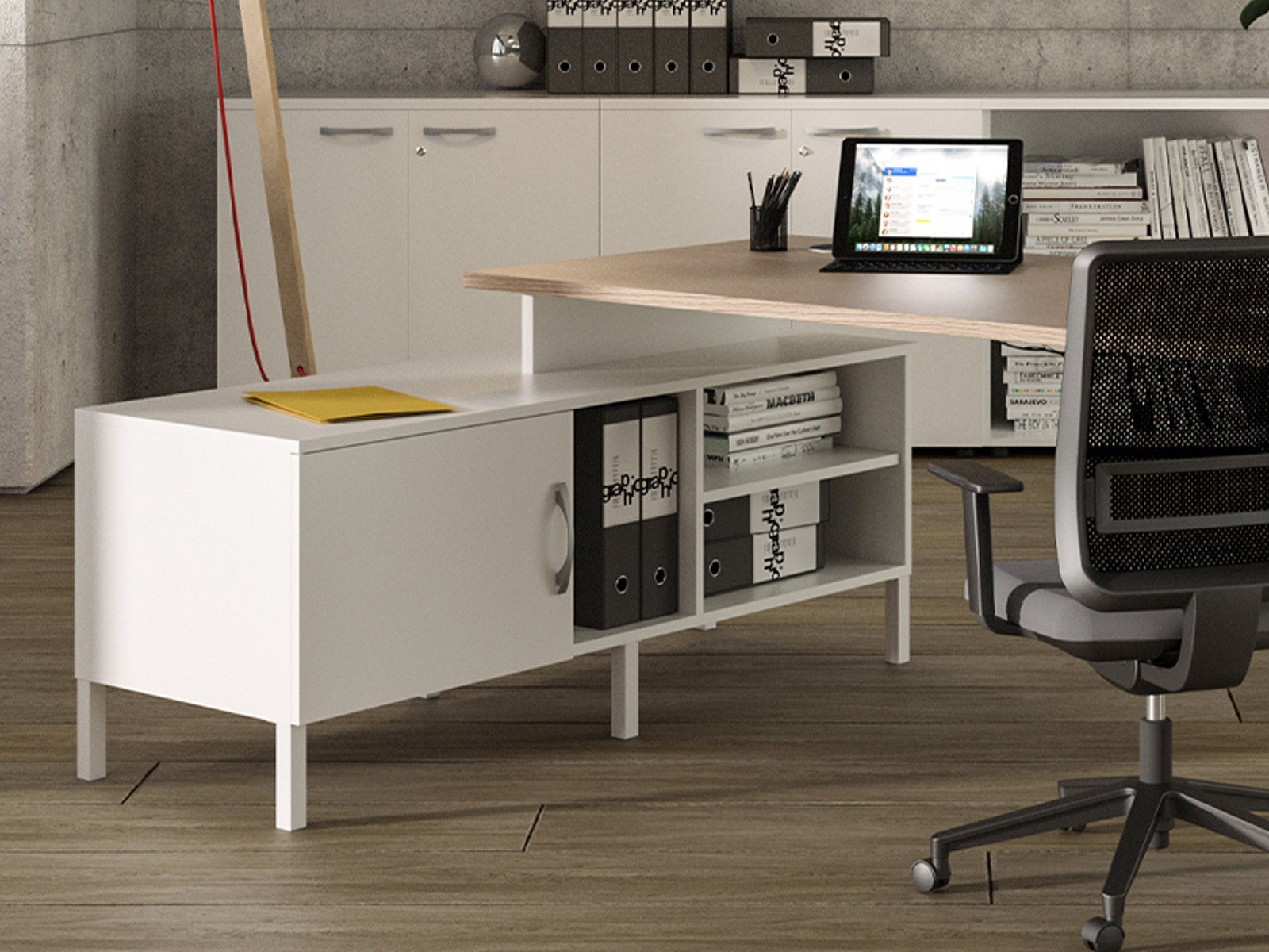 Le bureau sur crédence Ponti par Exmob est une solution économique pour les utilisateurs à la recherche d'un bureau avec rangement professionnel. Sa conception en bois mélaminé de 25 mm et son piètement métallique confèrent une impression de robustesse. Un gage de qualité made in Italy.