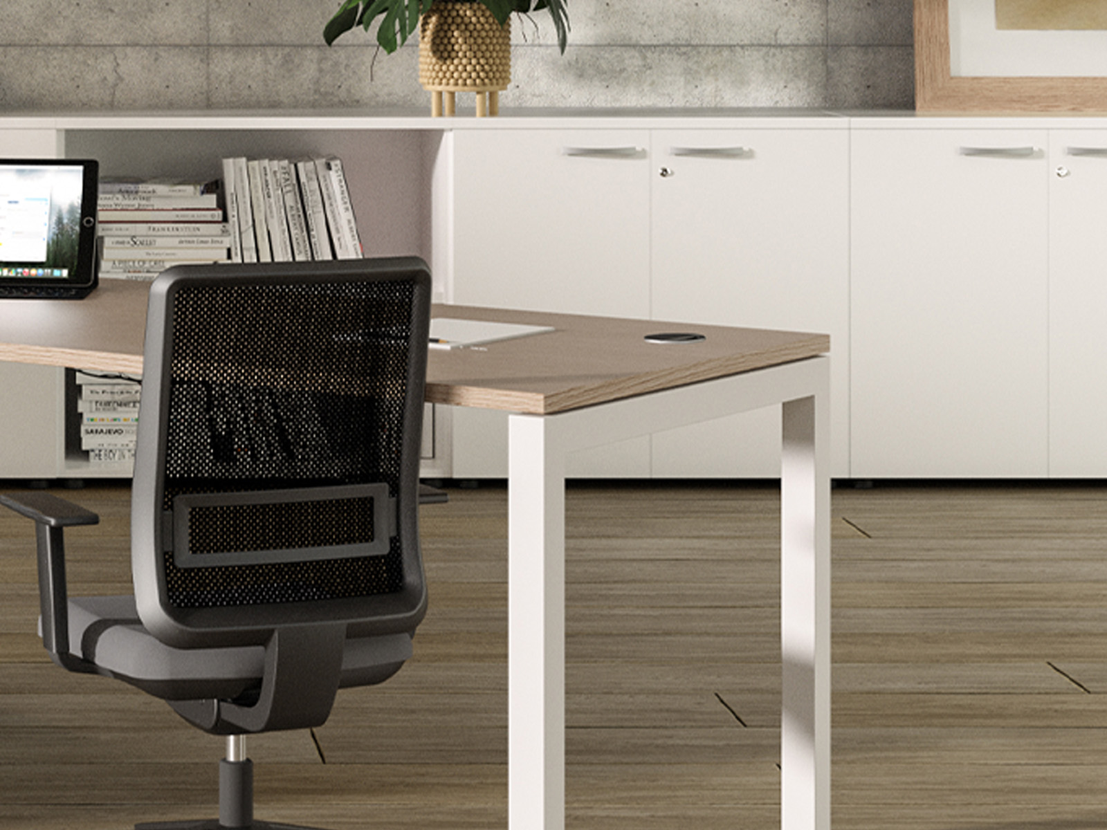 obturateurs ronds de 80 mm sont inclus pour un passage simplifié des câbles au bureau. Ce bureau individuel est avant tout pratique grâce à sa crédence qui offre un rangement de proximité à l'utilisateur. Le plateau repose directement dessus. La crédence mesure