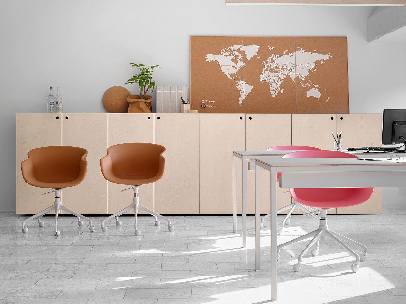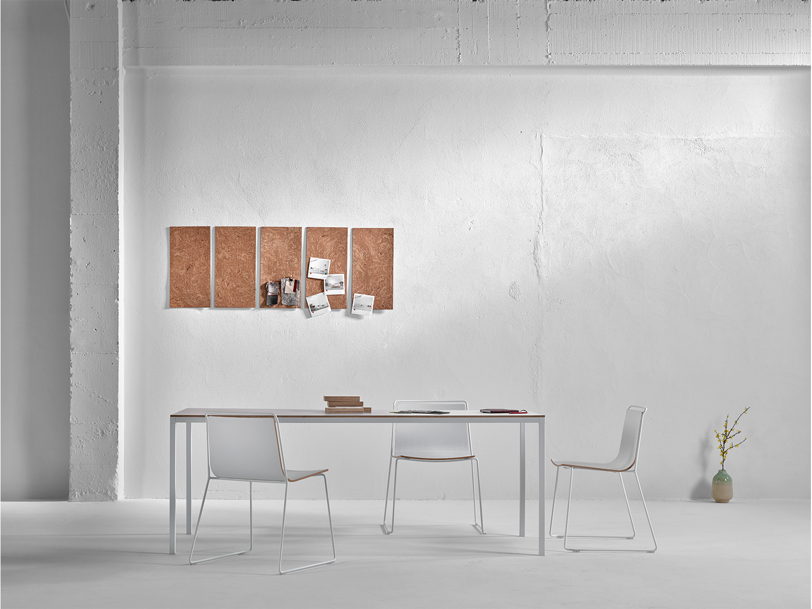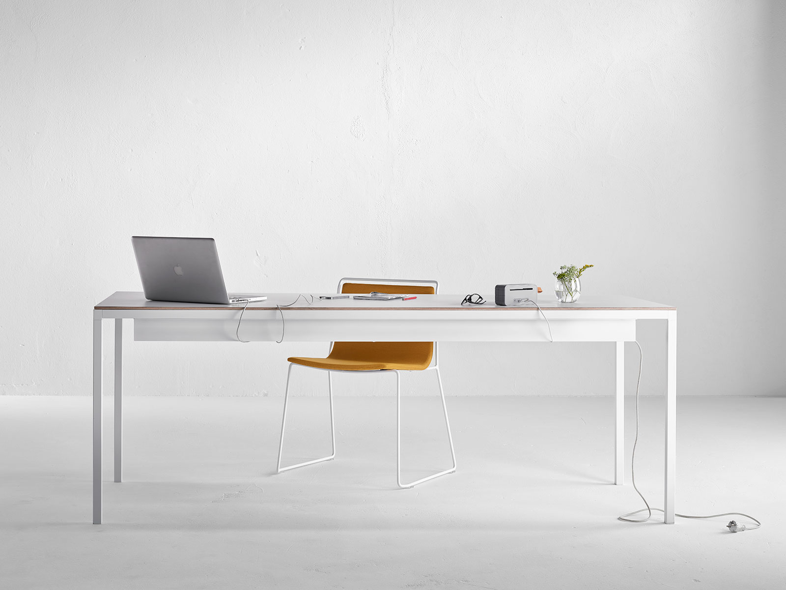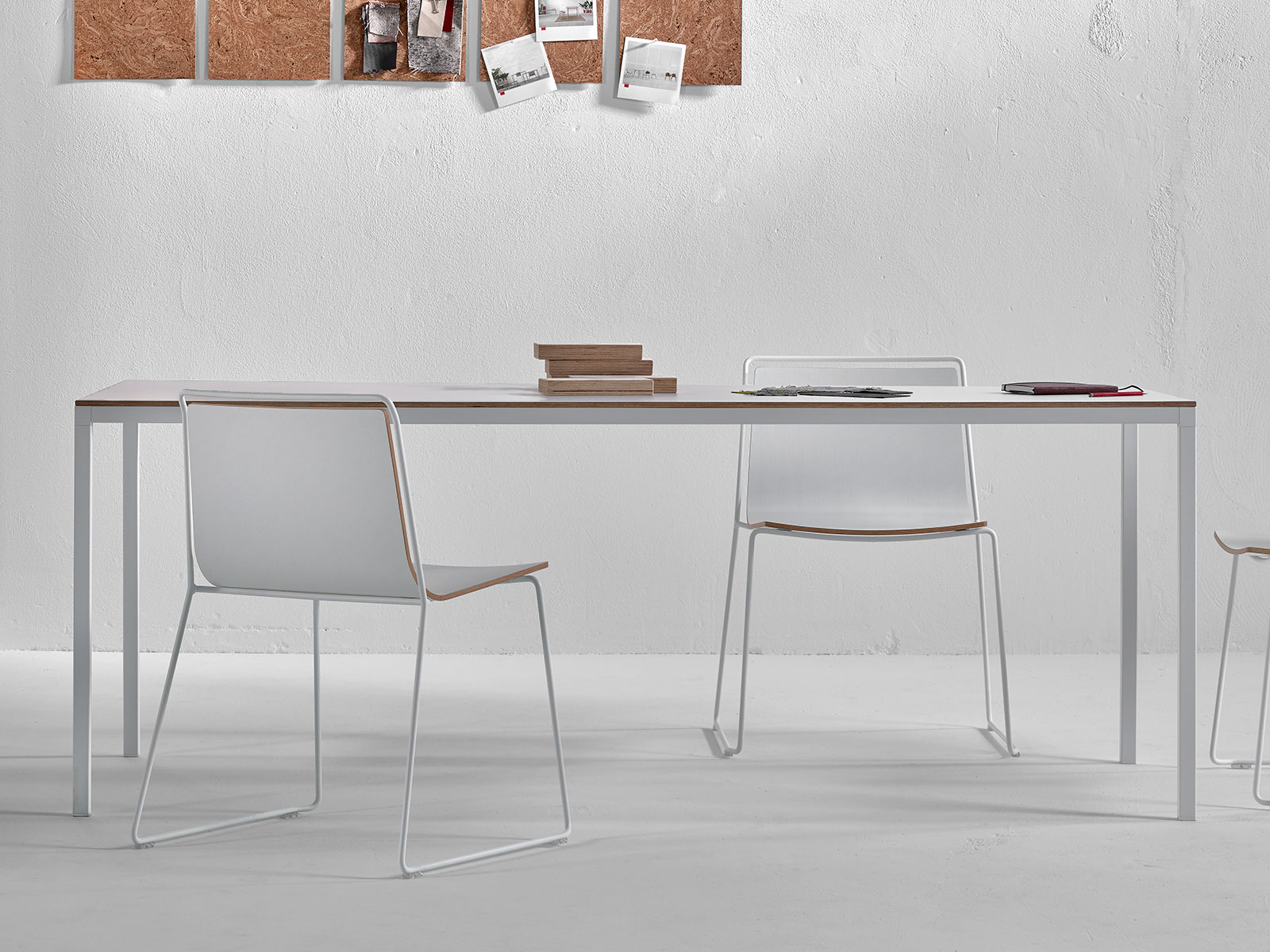 Dry est un bureau atypique avec une structure fine et épurée et un plateau en multiplis de bouleau recouvert d'un décor en mélaminé. Le multiplis apparent est très esthétique et lui apporte chaleur, qualité et modernité. Dry peut convenir aussi bien en tant que bureau individuel que table de travail.