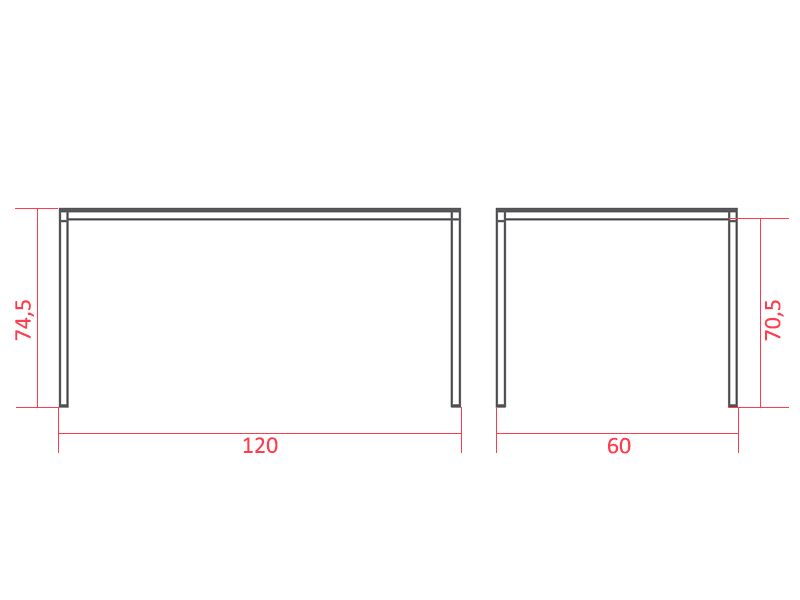 Dry existe également en version carré, versions hauteurs 40, 90 et 110 cm et en plus grandes largeurs, sur demande. Le plateau est disponible en 17 finitions de mélaminé (voir le nuancier), en Fenix, hêtre teinté, chêne teinté ou en verre, sur demande. Le bureau mesure 74,5 cm de hauteur.