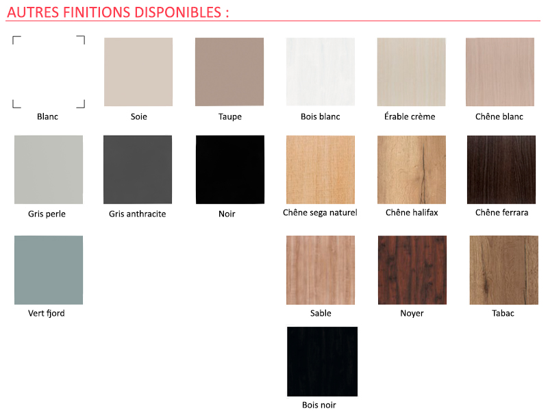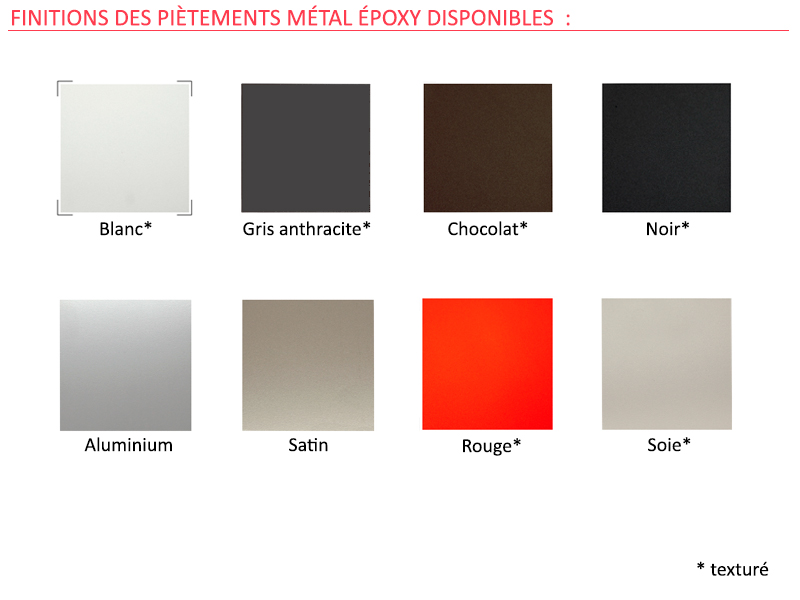 Les pieds de forme arche sont en métal avec peinture époxy. Ils sont disponibles en 8 finitions : aluminium, satiné, blanc, gris anthracite, chocolat, noir, rouge et soie. Les 6 dernières sont texturées.