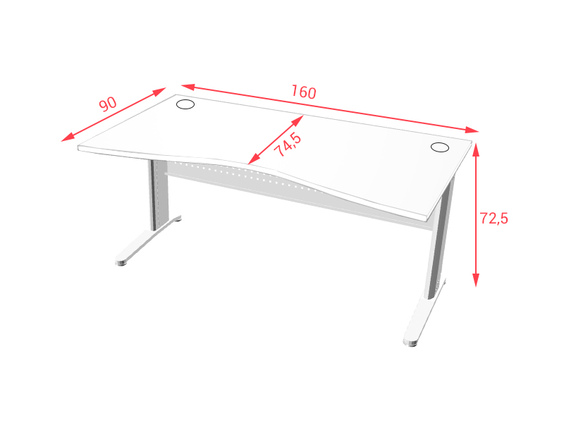 Le plateau est en bois mélaminé d'épaisseur 25 mm avec chants PVC antichocs 2 mm et mesure 160 cm de large pour une profondeur de 90 cm au plus profond et 74,5 au centre. Il est en vague et symétrique pour un meilleur confort de travail. 9 finitions de plateau sont disponibles : blanc, gris clair, grège, noyer naturel, ébène cendré, chêne clair, chêne brut, walnut ambré et acacia.
