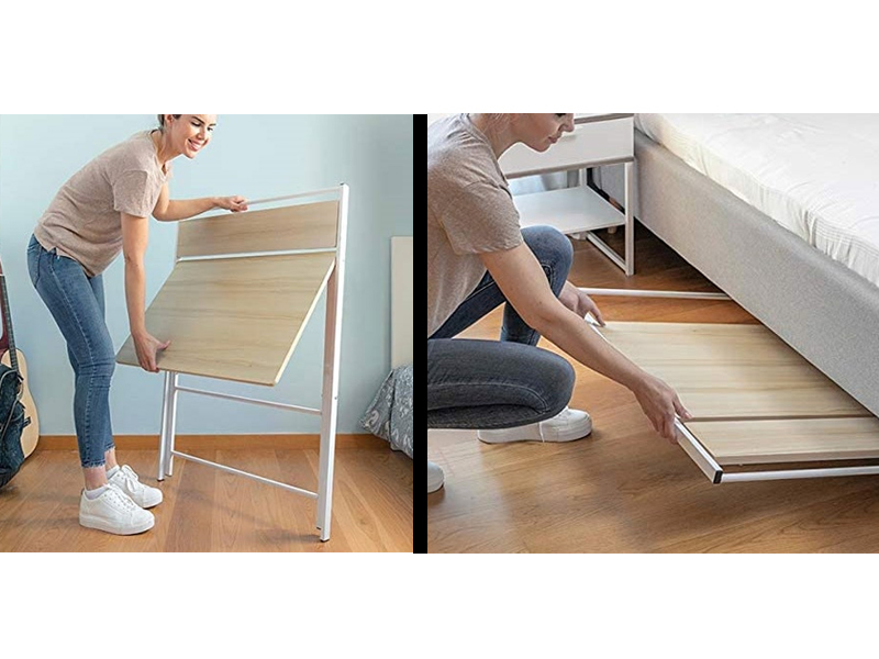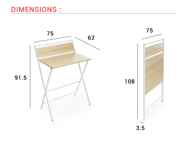 Voici un bureau dédié au home office (travail à la maison ou télétravail) grâce à son utilisation très facile. En effet le bureau pourra être plié et déplié à volonté et cela très simplement : une seule minute est nécessaire pour le mettre en place. Une fois replié, son épaisseur est de 35 mm, il pourra donc être rangé facilement dans un placard par exemple.