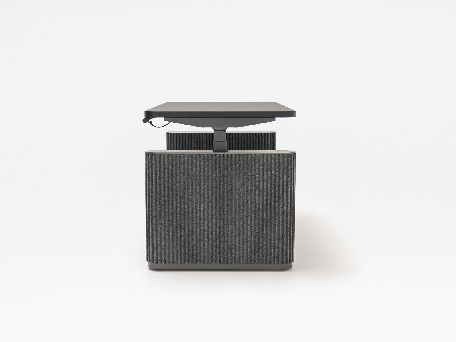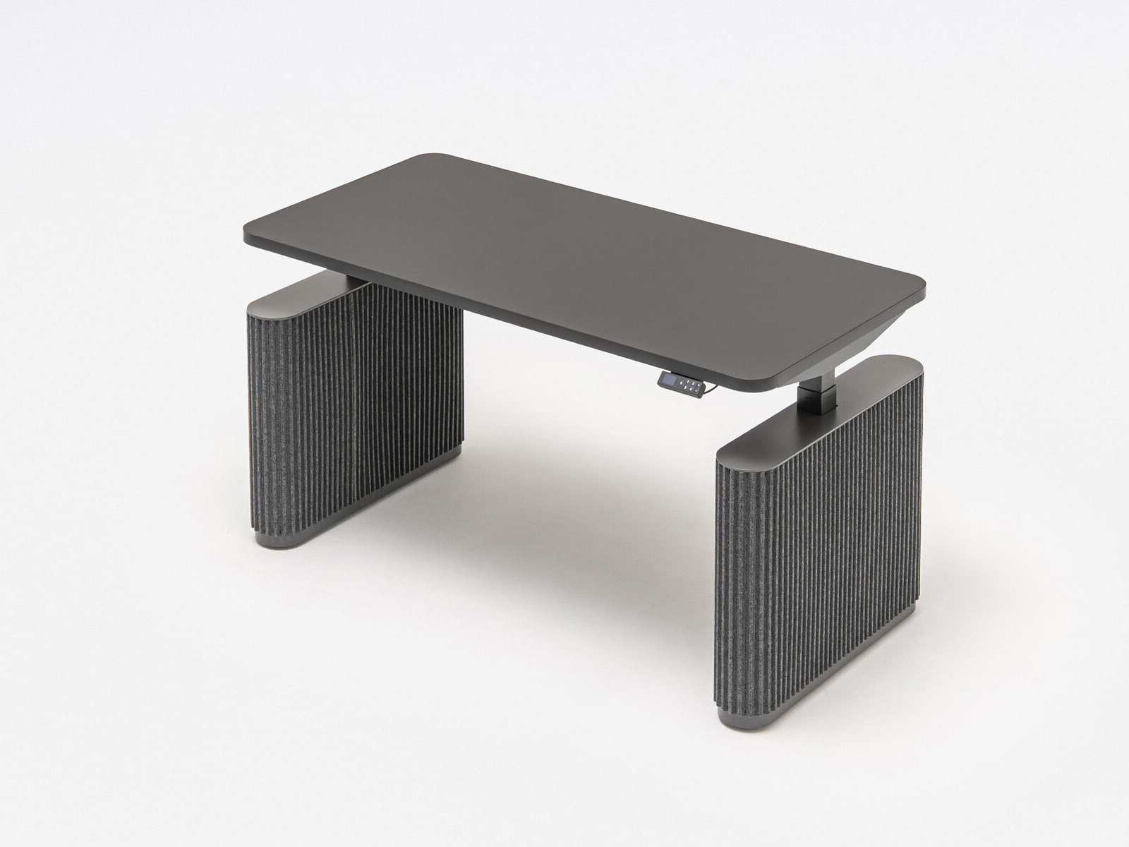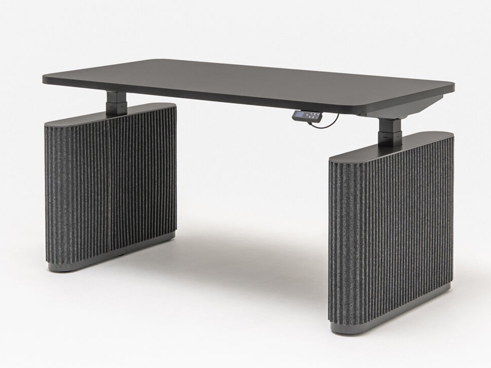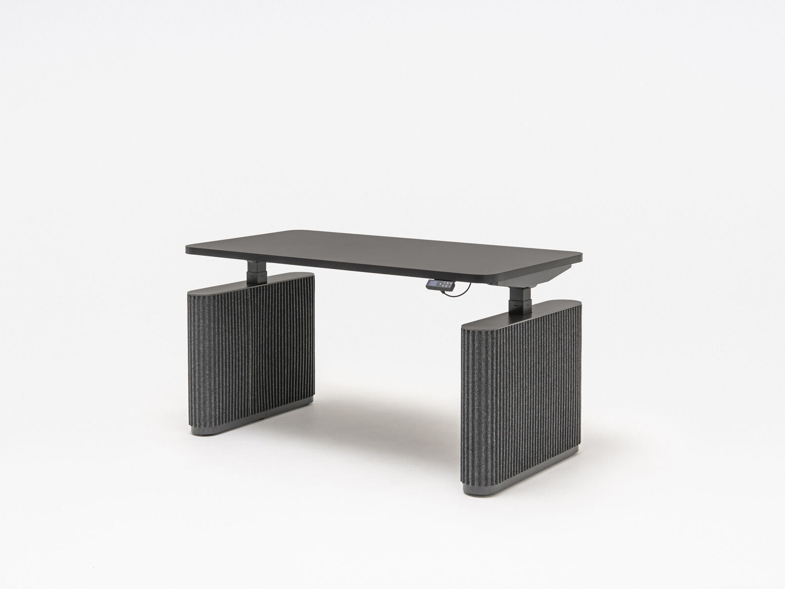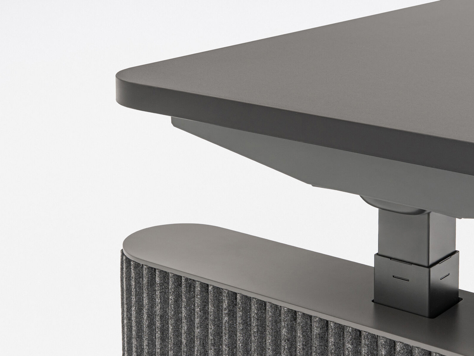 Le pied panneau est revêtu de feutre PET offrant une fonction acoustique qui atténue les bruits et réduit les stimuli perturbateurs dans les espaces ouverts, tout en masquant élégamment la structure et le câblage. Le plateau mélaminé de 28 mm avec chant ABS de 2 mm complète l'ensemble.