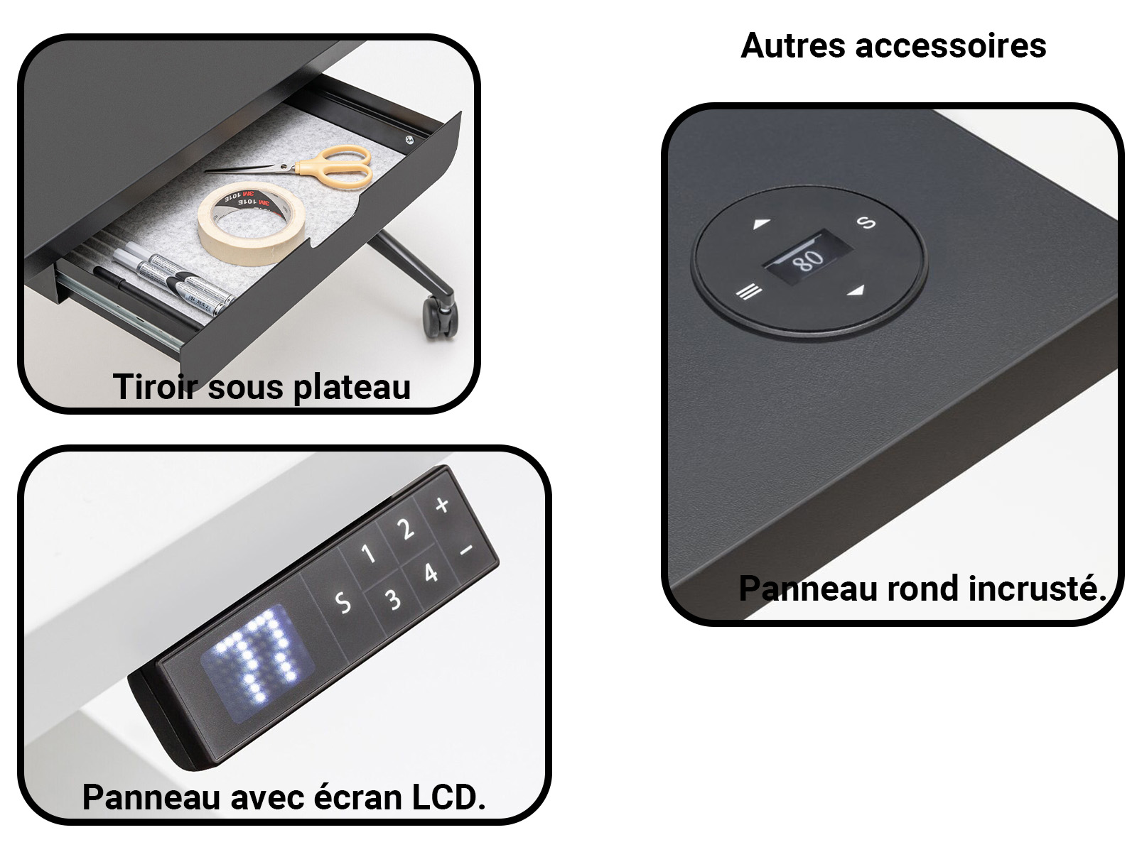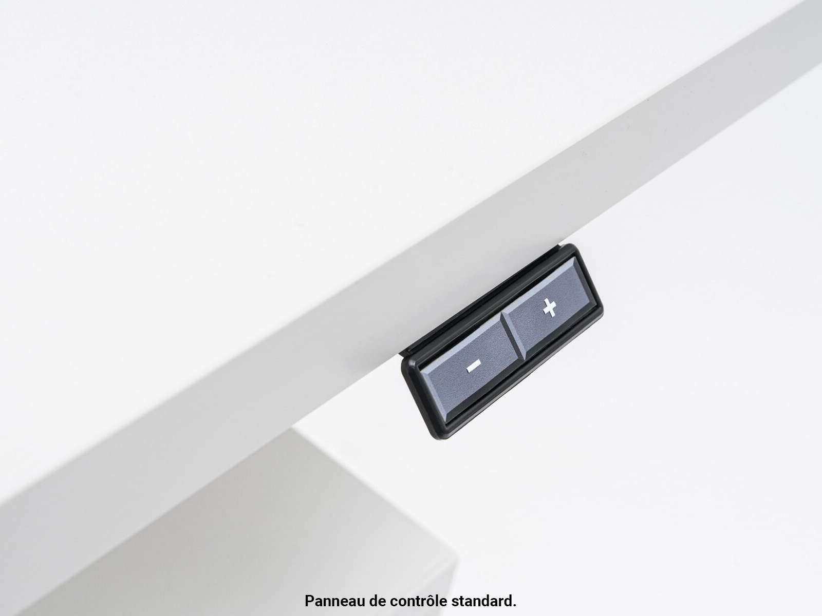 Plusieurs panneaux de commande sont disponibles : un panneau de base, une option avec mémorisation de hauteur, ou un panneau de contrôle rond intégré au plateau, tous avec sensibilité anti-collision réglable sur 3 niveaux.