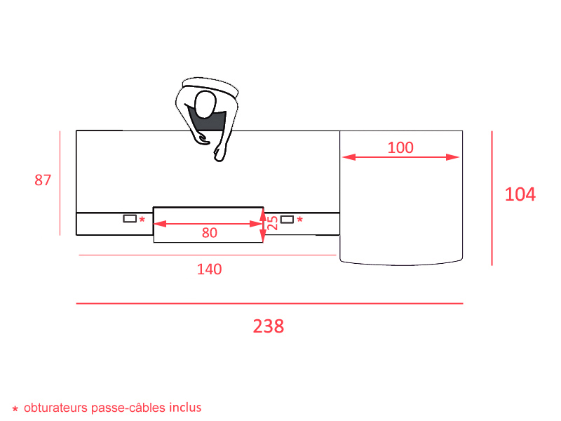 Le plateau du module "debout" est celui qui possède la réhausse. Il est disponible en 4 largeurs : 140, 160, 180 et 200 cm. Il a une profondeur de 80 cm et se situe à 73 cm du sol (hauteur sous plateau 70,5 cm). Le module debout est équipé de 2 top access de chaque côté du plateau et d'une goulotte pour faciliter le passage des câbles vers le sol.