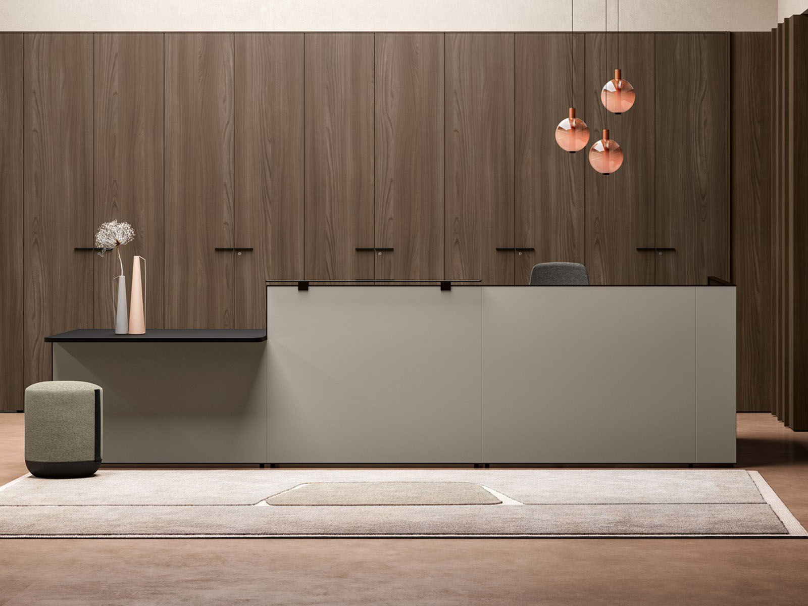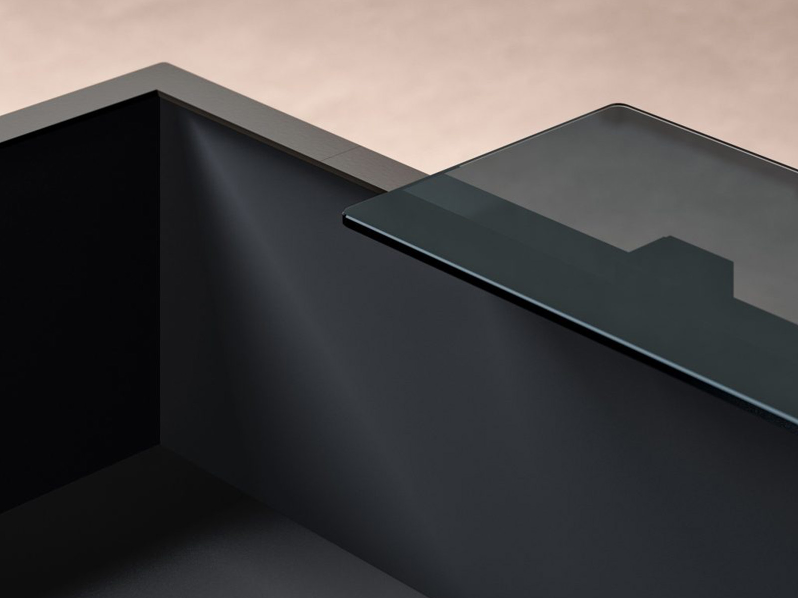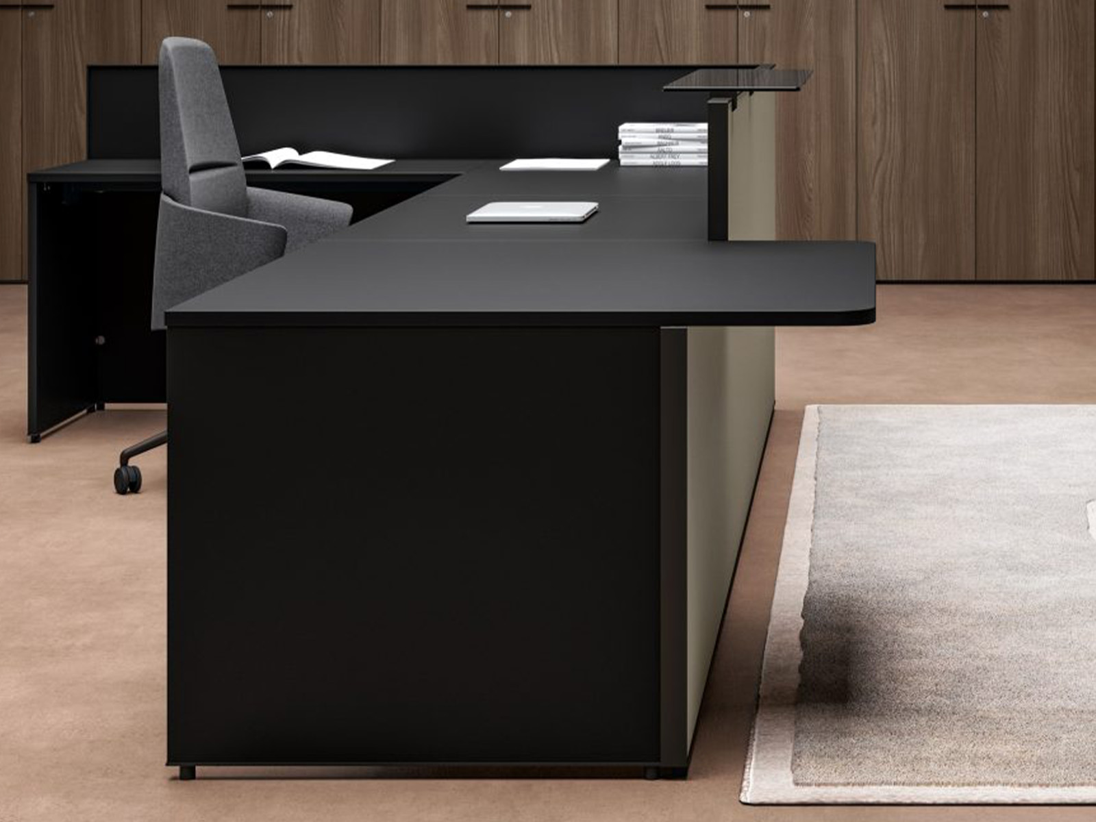 module PMR permettant un accueil accessible aux personnes à mobilité réduite, conformément aux exigences d’accessibilité des espaces professionnels. La façade laquée soulignée par un contour métallique de 40 mm apporte une signature esthétique forte, tandis que l’étagère en verre trempé noir structure l’ensemble avec légèreté et modernité.