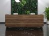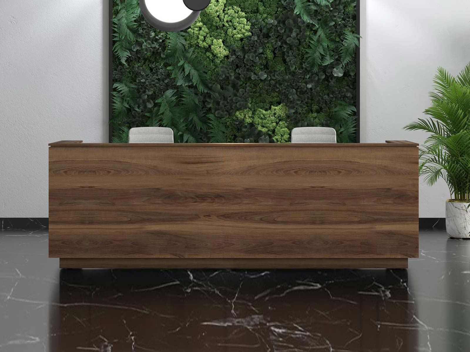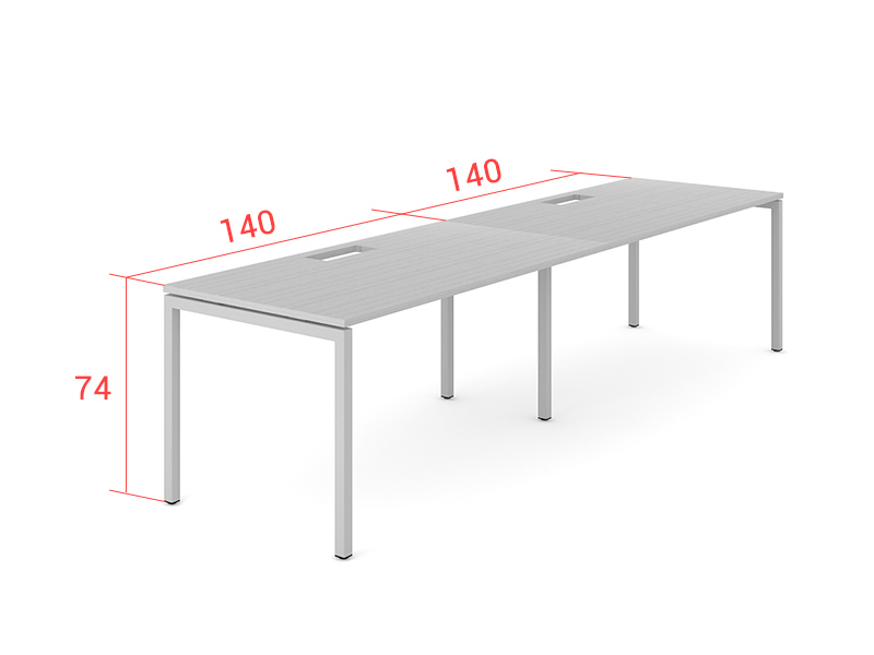 Fragment propose un comptoir d'accueil de grande élégance avec des panneaux extérieurs et un comptoir en placage de bois. Il comprend 2 postes de travail de 140 cm chacun, installés sur la même structure, proposés en mélamine et disponibles en 6 coloris. La structure des postes est en métal et disponible en 3 coloris. Les postes sont également chacun équipés d'une trappe passe-câbles et d'une goulotte horizontale.