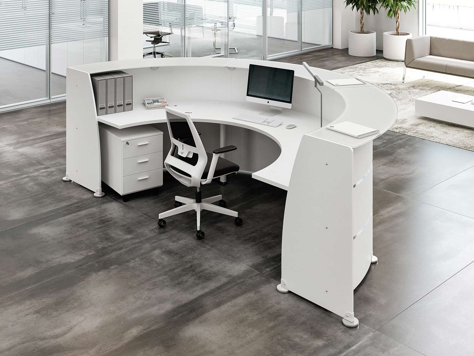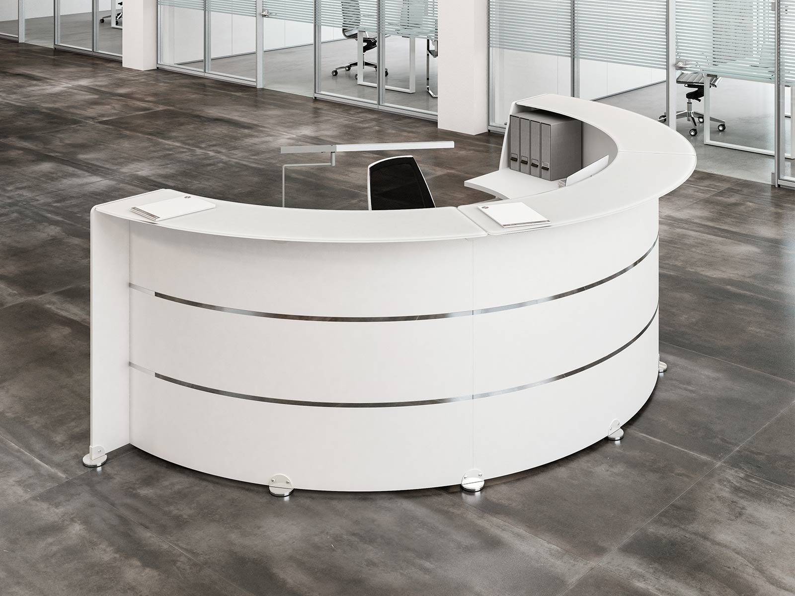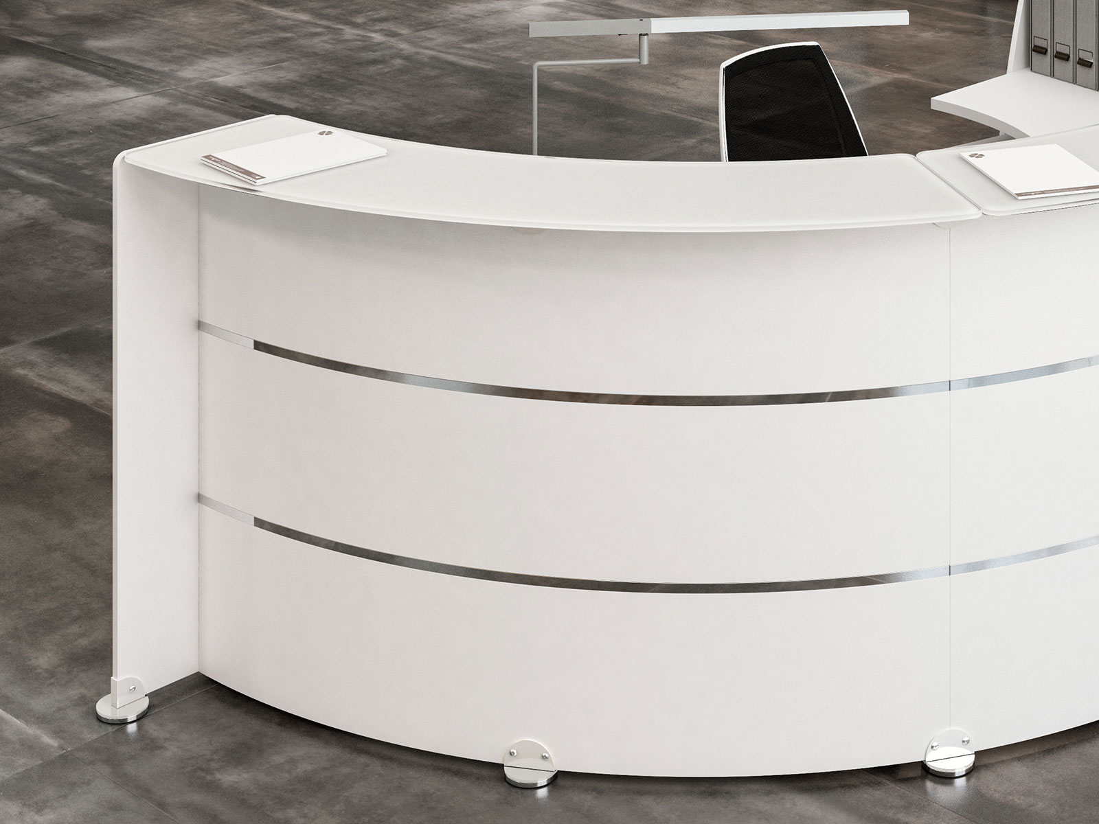 La banque d'accueil Elantra fera forte impression dans vos locaux avec sa forme en demi-lune très élégante. Les tops en verre (hauteur de 1,12 m, profondeur de 40 cm) participent aussi à cette impression de qualité que ressentiront vos clients. Des bandes chromées peuvent être ajoutées à la façade pour rehausser encore l'apparence de la banque.