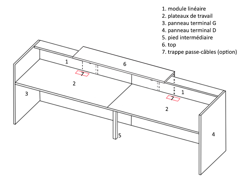 Etner propose d'ajouter en option un lot de 2 top access pour faciliter le passage des câbles, un éclairage LED pour mettre en valeur la réhausse de la banque, une bande LED éclairant le plan de travail, à fixer sous le top (nous contacter) et un lot de 2 supports d'unité centrale.