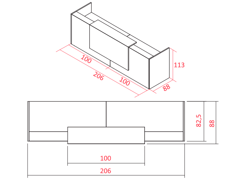 Les modules, panneaux et plateaux droits sont en bois mélaminé d'une épaisseur allant de 25 à 30 mm. Les 2 plateaux sont disponibles au choix en largeur 100, 120, 140 ou 160 cm pour une profondeur 80 cm (voir schéma). La banque est proposée en largeur 206, 246, 286 et 326 cm pour une profondeur de 88 cm. La hauteur du comptoir est de 113 cm.