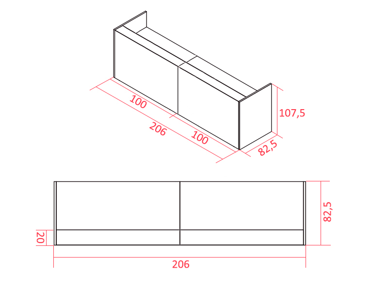 Les 2 plateaux sont disponibles au choix en largeur 100, 120, 140 ou 160 cm pour une profondeur 80 cm (voir schéma). La banque est proposée en largeur 206, 246, 286 et 326 cm pour une profondeur de 82,5 cm. La hauteur du comptoir est de 107,5 cm. Le plateau du bureau se situe à 73 cm du sol.