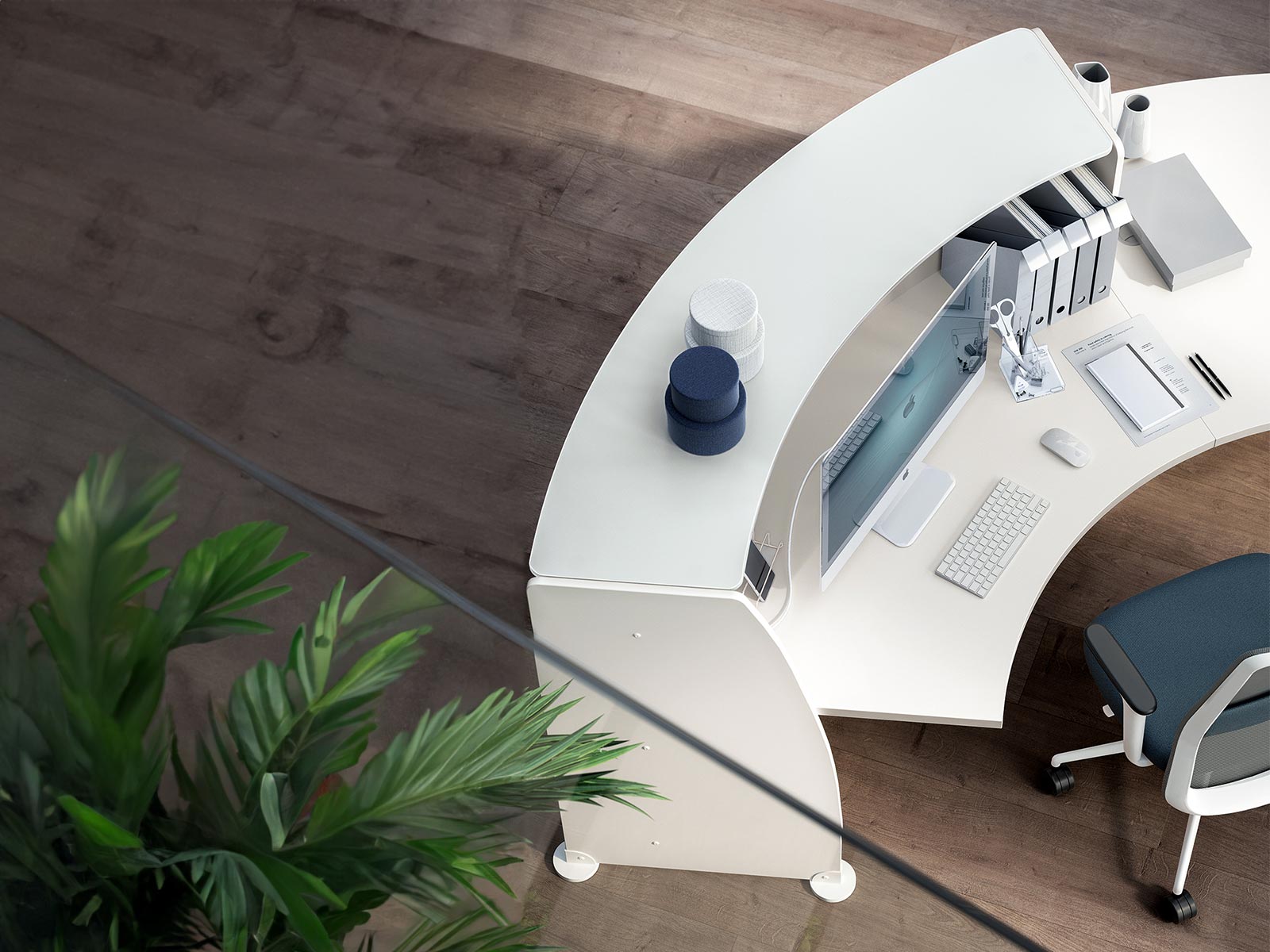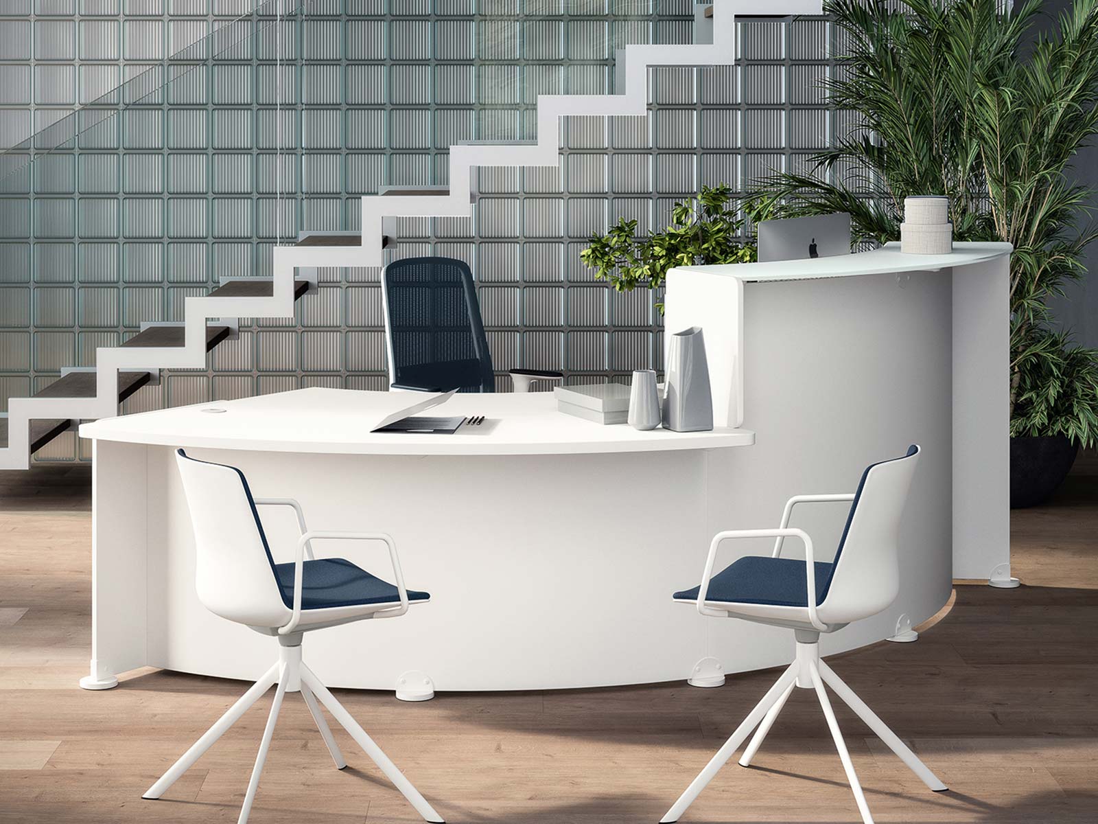 verre trempé de 10 mm d'épaisseur et d'une finition blanc opaque uniquement. Le verre est facile d'entretien tout en étant très résistant, ce qui est idéal pour une surface d'échange avec le public.