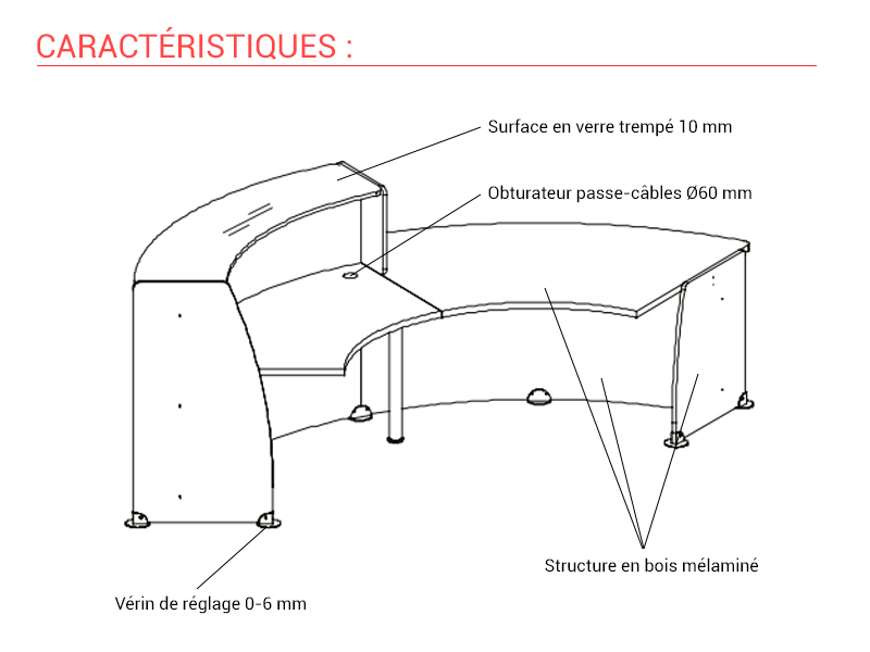 La banque d'accueil se compose d'une structure en bois mélaminé de haute qualité et de 18 mm d'épaisseur. Le plan de travail est aussi en mélaminé, mais d'une