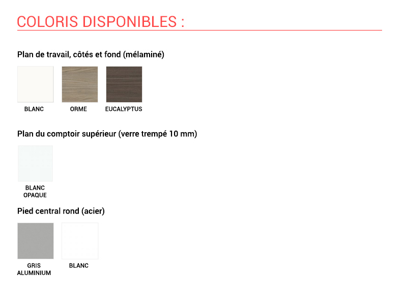épaisseur de 30 mm, offrant durabilité et résistance. Les finitions disponibles pour la structure sont le blanc comme présentée sur la photo mais également des finitions bois comme le Orme et l'Eucalyptus. Un large choix de coloris laqués sont également disponibles mais engendre un surcoût (nous contacter pour plus d'informations).