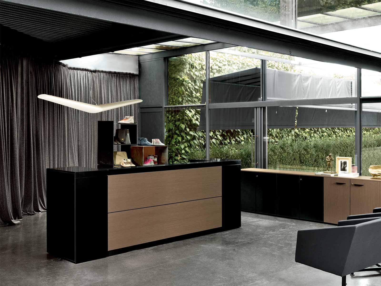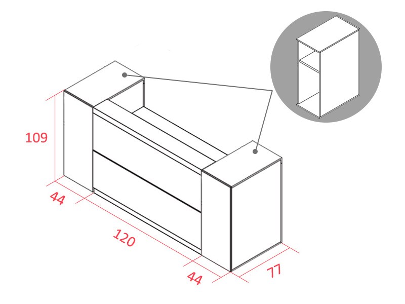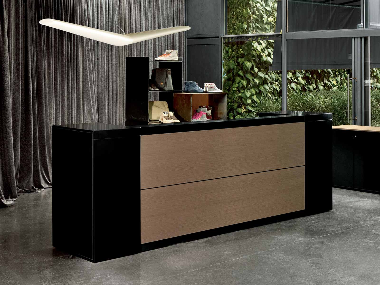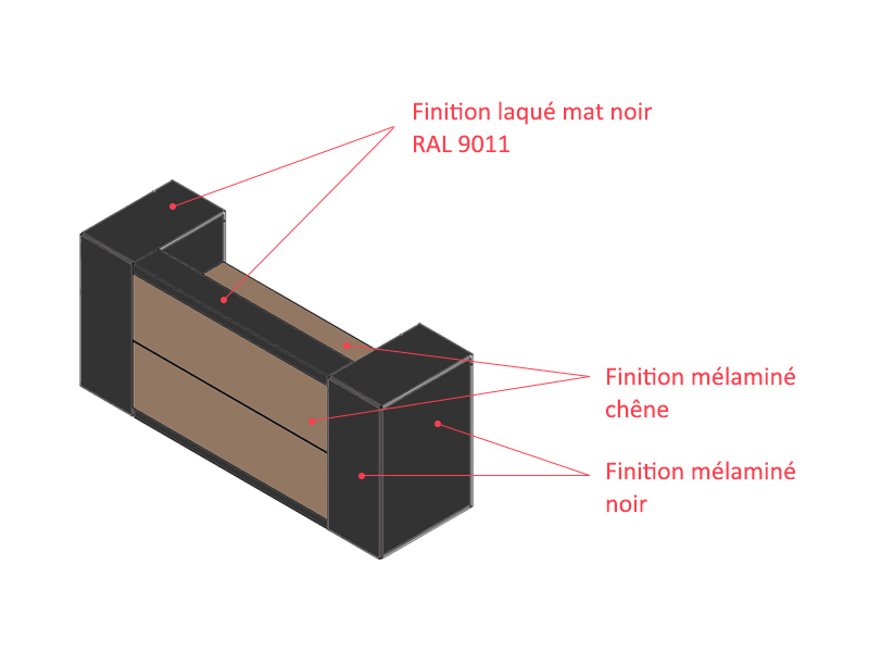 La collection Vogue a pour objectif de proposer des banques et comptoirs d'accueils compacts de grande qualité. Le modèle proposé ici dispose d'un faible encombrement (208, 248 ou 288 cm de longueur) tout en proposant un espace de travail confortable. Il est complété par 2 modules de rangements sur ses extrémités qui pourront être ouverts ou fermés par une porte battante. Il sera même possible en option d'ajouter un caisson avec tiroirs à l'intérieur des modules pour plus d'ergonomie. La façade de la banque est en bois mélaminé de finition chêne accordée avec le plateau de travail. Le comptoir est en finition laqué noir pour un plus bel effet sur vos visiteurs.