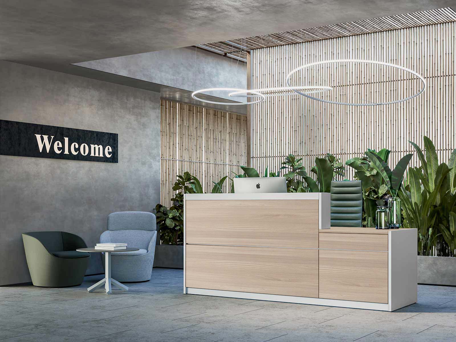 Le comptoir d'accueil sur le lequel vos visiteurs viendront s'adosser est de 21 cm de profondeur, en finition laqué mat. Il pourra être complété par une surface en verre de 30 cm, plus pratique et résistante aux chocs et rayures (voir option).