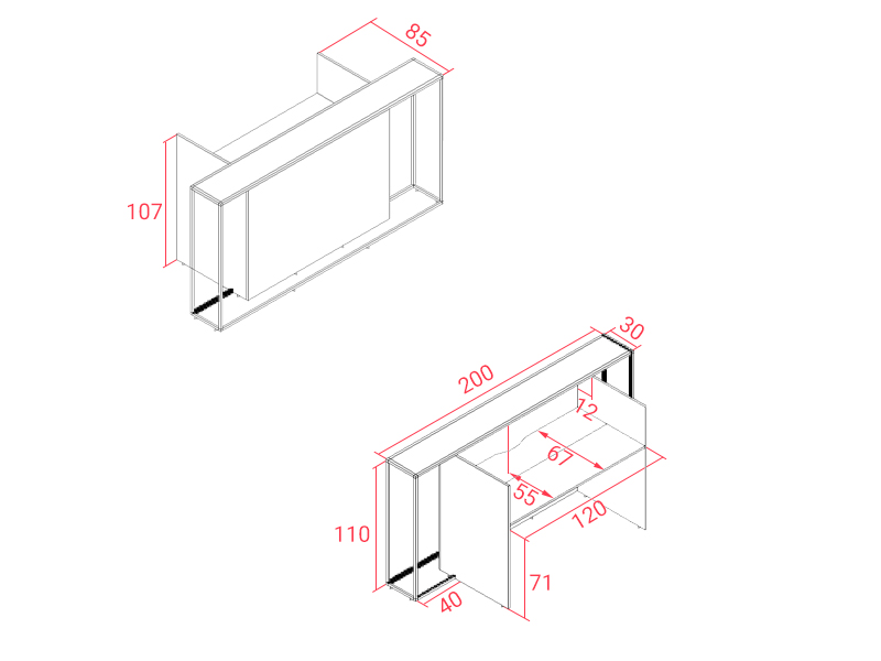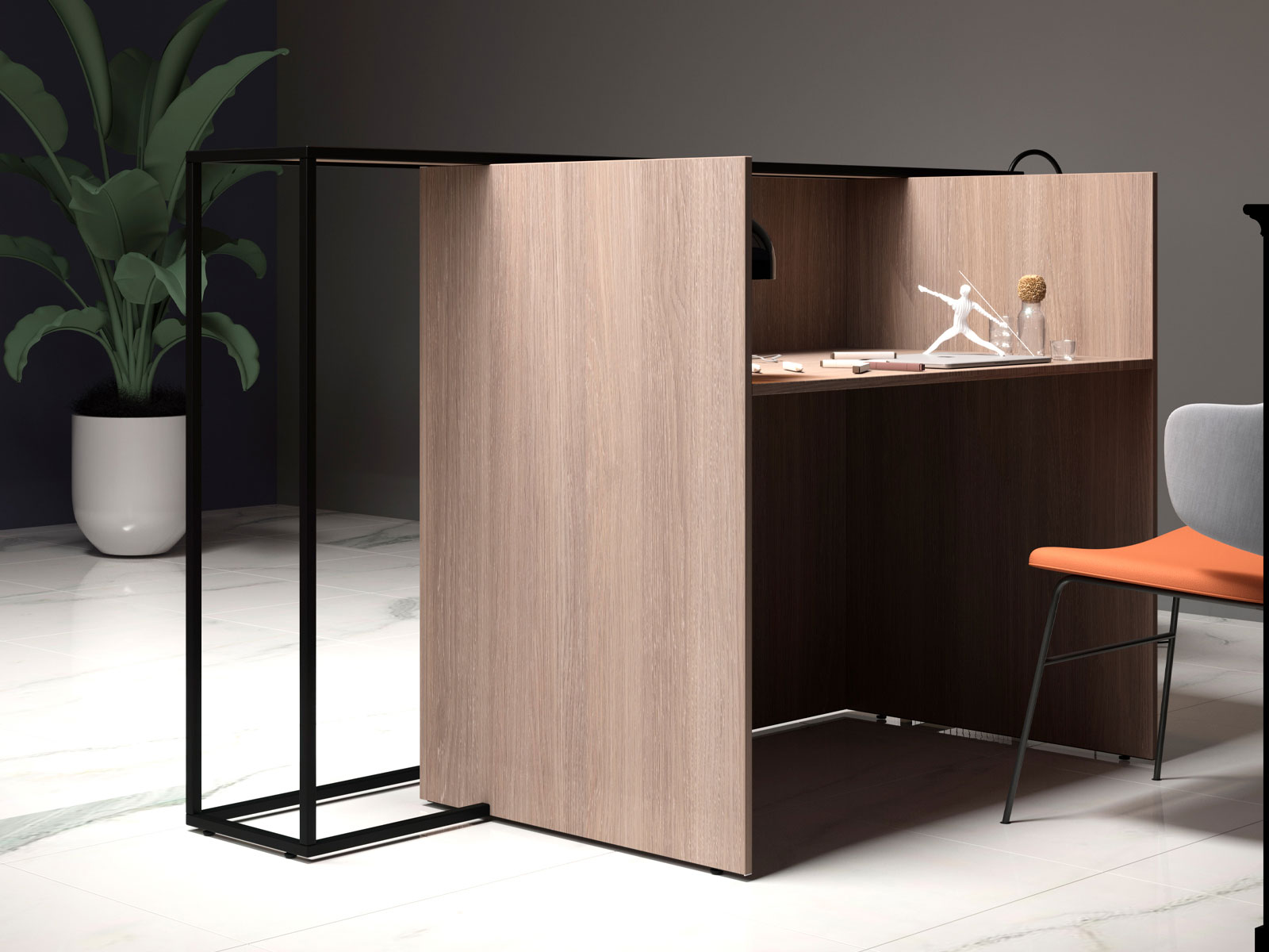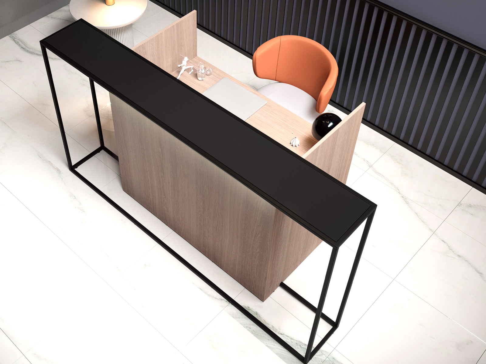 Le comptoir est un cadre métallique de 110 cm de haut, dans lequel est inséré un plateau en bois mélaminé de 30 cm de profondeur. Ces dimensions sont confortables pour réceptionner convenablement les visiteurs. A noter que le comptoir déborde de 15 cm sur le haut du bureau.