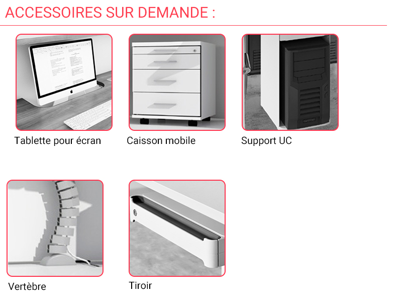 Le plateau est maintenu par une poutre en son centre afin de garantir la stabilité nécessaire. Pour une meilleure ergonomie, le bureau s’équipe d’accessoires (présentez ci-dessous) en option ou sur demande. On apprécie la petite échancrure sur le plateau qui facilite le câblage de vos périphériques.