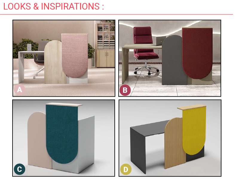 Averto se personnalise selon vos exigences, la tablette du comptoir, la structure, le plan de travail, le panneau secondaire et le panneau en tissu ou encore les chants peuvent tous aborder des finitions différentes ou s'unir selon votre convenance. Depuis nos visuels et notre configurateur, nous proposons des tons bicolores ou tricolores en noir, blanc, bleu ou vert. Le panneau rembourré d'un tissu reste gris.