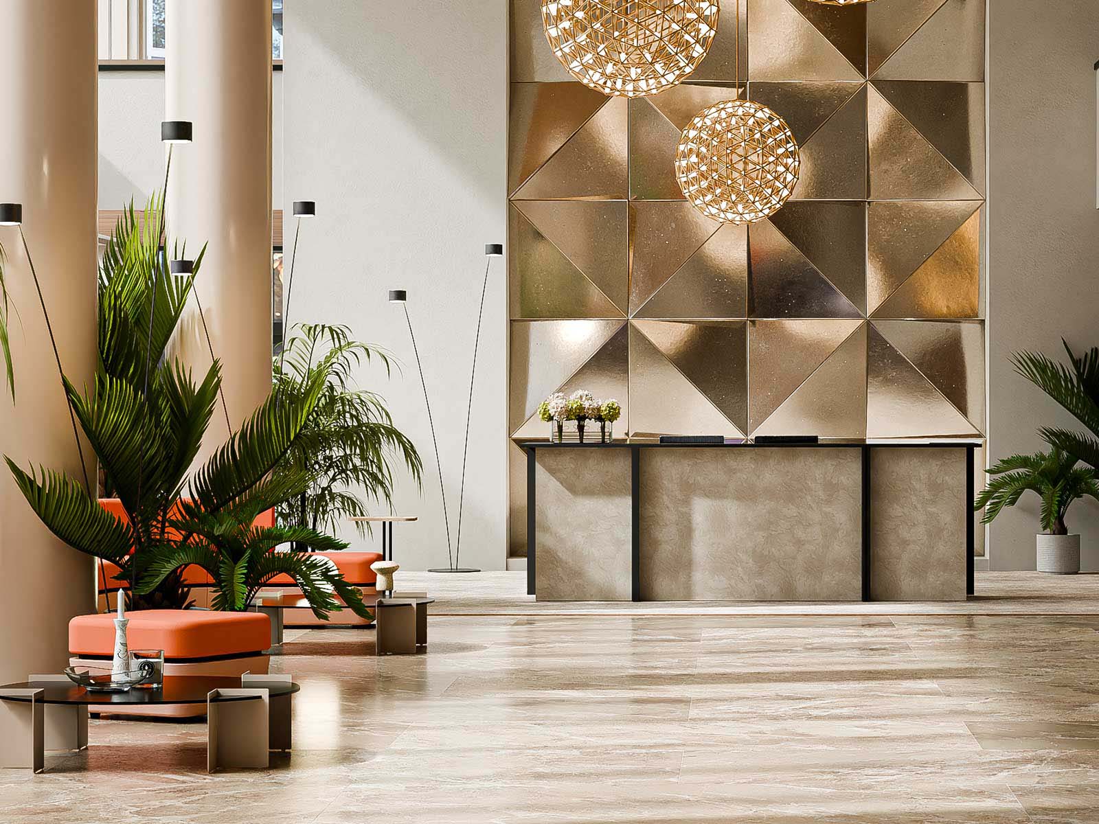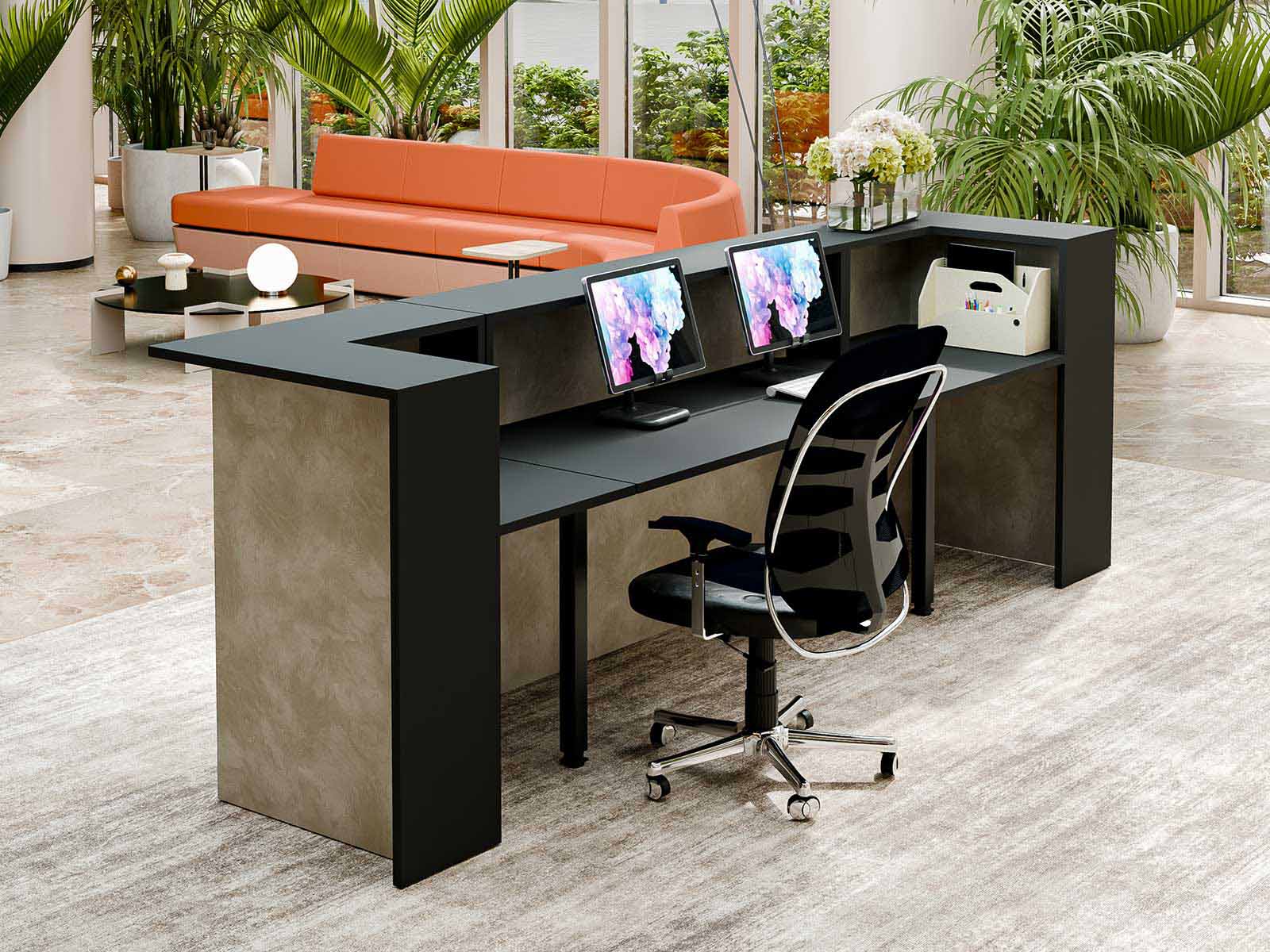 Vero s’inspire des formes simples pour créer un espace de réception élégant, moderne et immédiatement professionnel. Minimaliste dans son esthétique mais généreuse dans ses possibilités, Vero s’adapte aussi bien aux projets architecturaux sobres qu’aux identités visuelles affirmées. Dans la configuration présentée — un