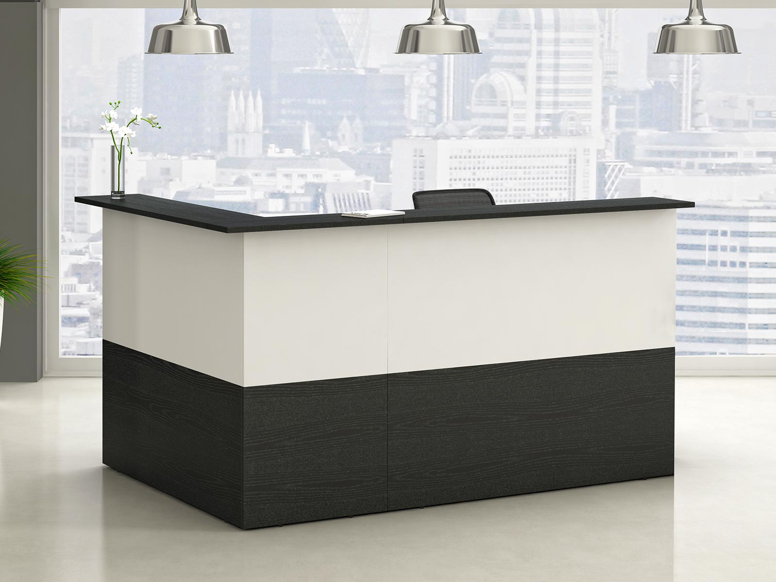 La banque d'accueil Musca se compose de plusieurs modules (droit, angle et pmr) afin de composer une banque d'accueil modulable répondant parfaitement à votre besoin. Le modèle proposé ici se compose d'un module droit (80, 120 ou 140 cm) et d'un module d'angle de 80 cm pour former un ensemble de petite et moyenne dimension. D'autres modules pourront y être ajoutés pour le compléter ou le modifier.