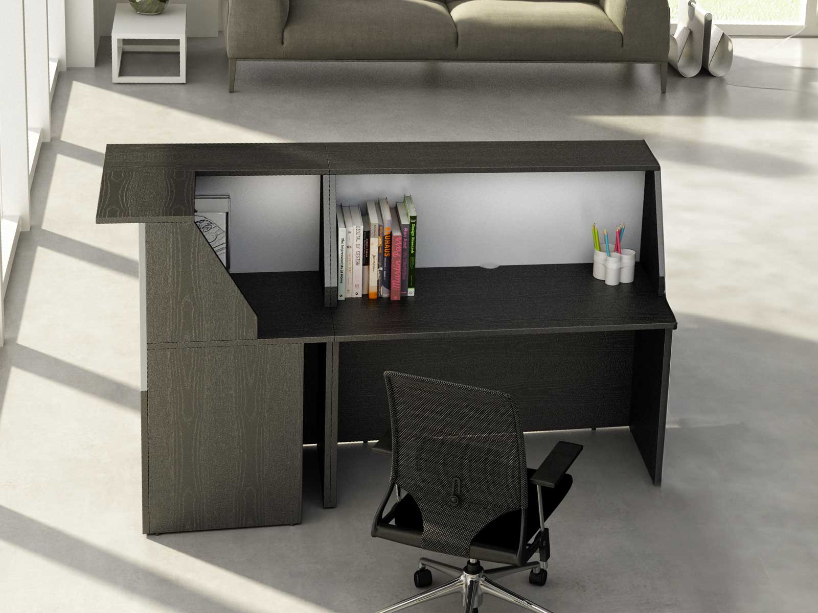 Le plan de travail est équipé d'une découpe pour le passage des câbles en son centre. Le plateau surélevé qui sert de comptoir d'échange avec vos visiteurs se trouve à 117 cm de hauteur et fait 30 cm de profondeur. La hauteur utile entre ce plateau et le plan de travail est de 43 cm, de quoi accueillir une large sélection de moniteur. Les modules sont équipés de vérins de réglage afin d'ajuster la hauteur en fonction du niveau du sol.