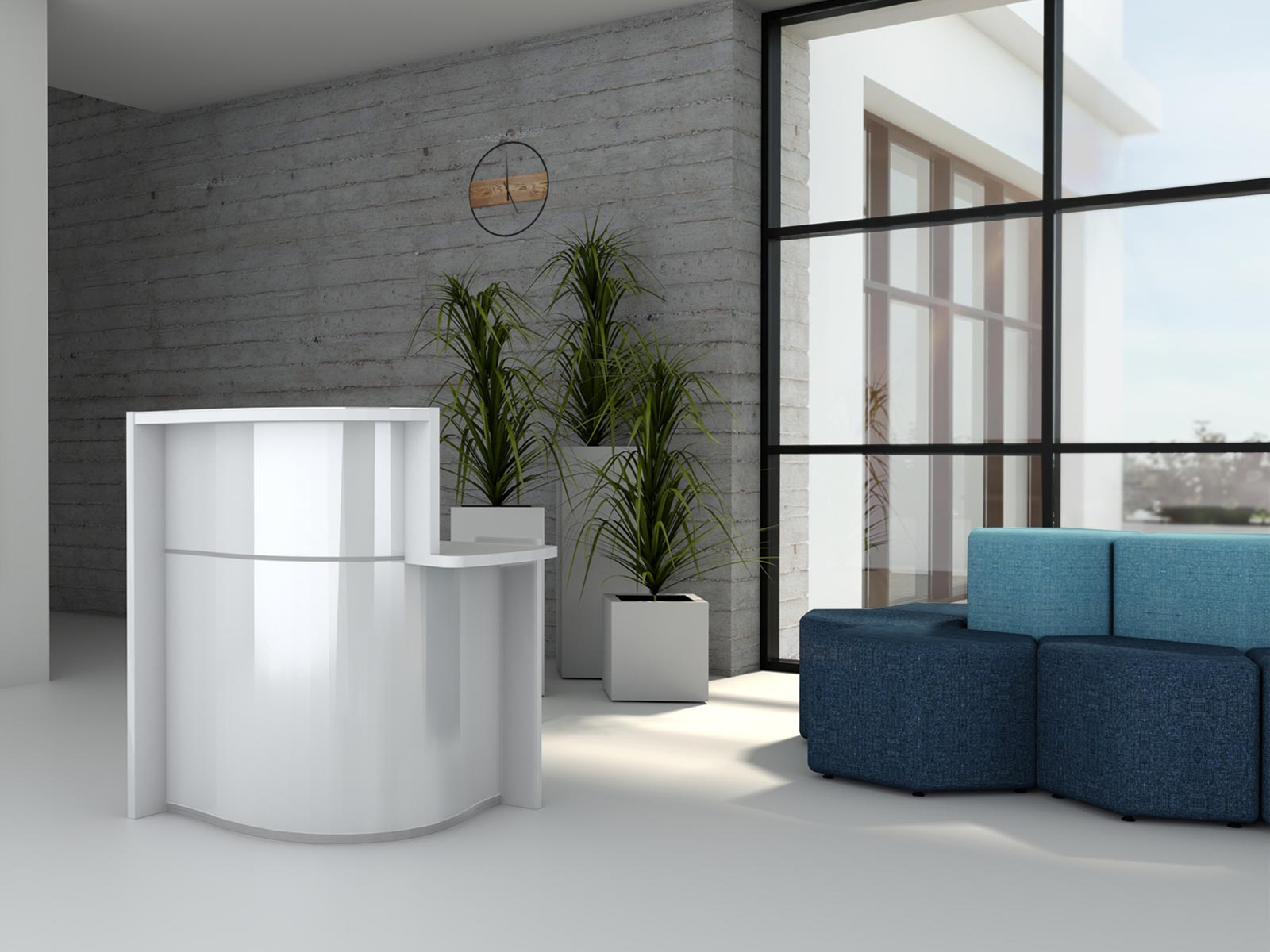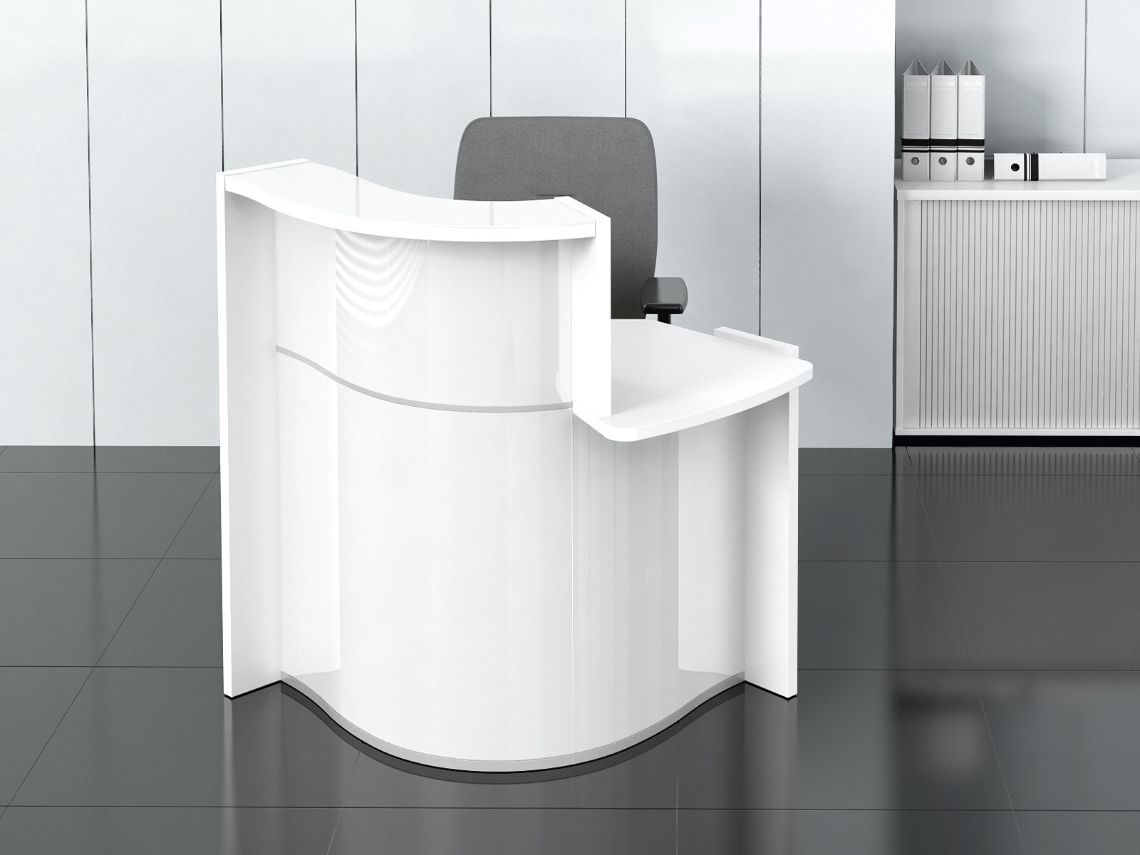 Idéale pour les petits espaces, cette banque d'accueil aux allures de comptoir propose un plan de travail avec passage des câbles et un accès pour personnes à mobilité réduite (PMR).