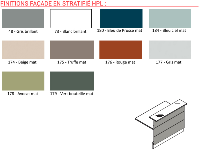 On apprécie sa forme compacte et arrondie et sa façade en stratifié brillant ou mat, voir le nuancier.