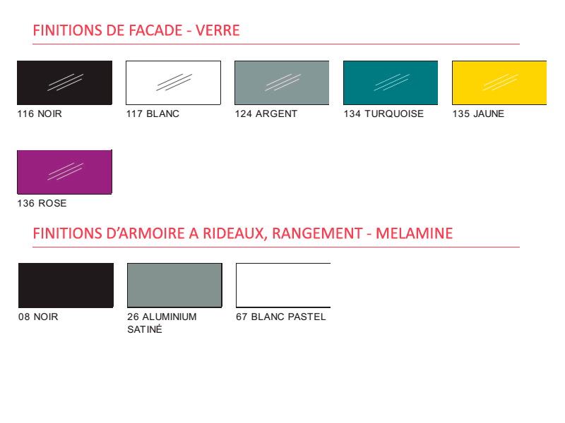 La façade en verre Lacobel d'épaisseur 4 mm est proposée avec une palette de finitions large et variée pour correspondre à toutes les décorations : noir, blanc, argent, turquoise, jaune et rose.