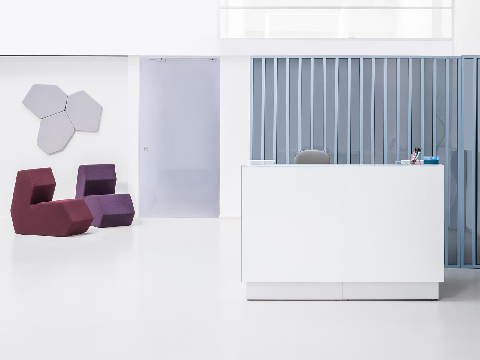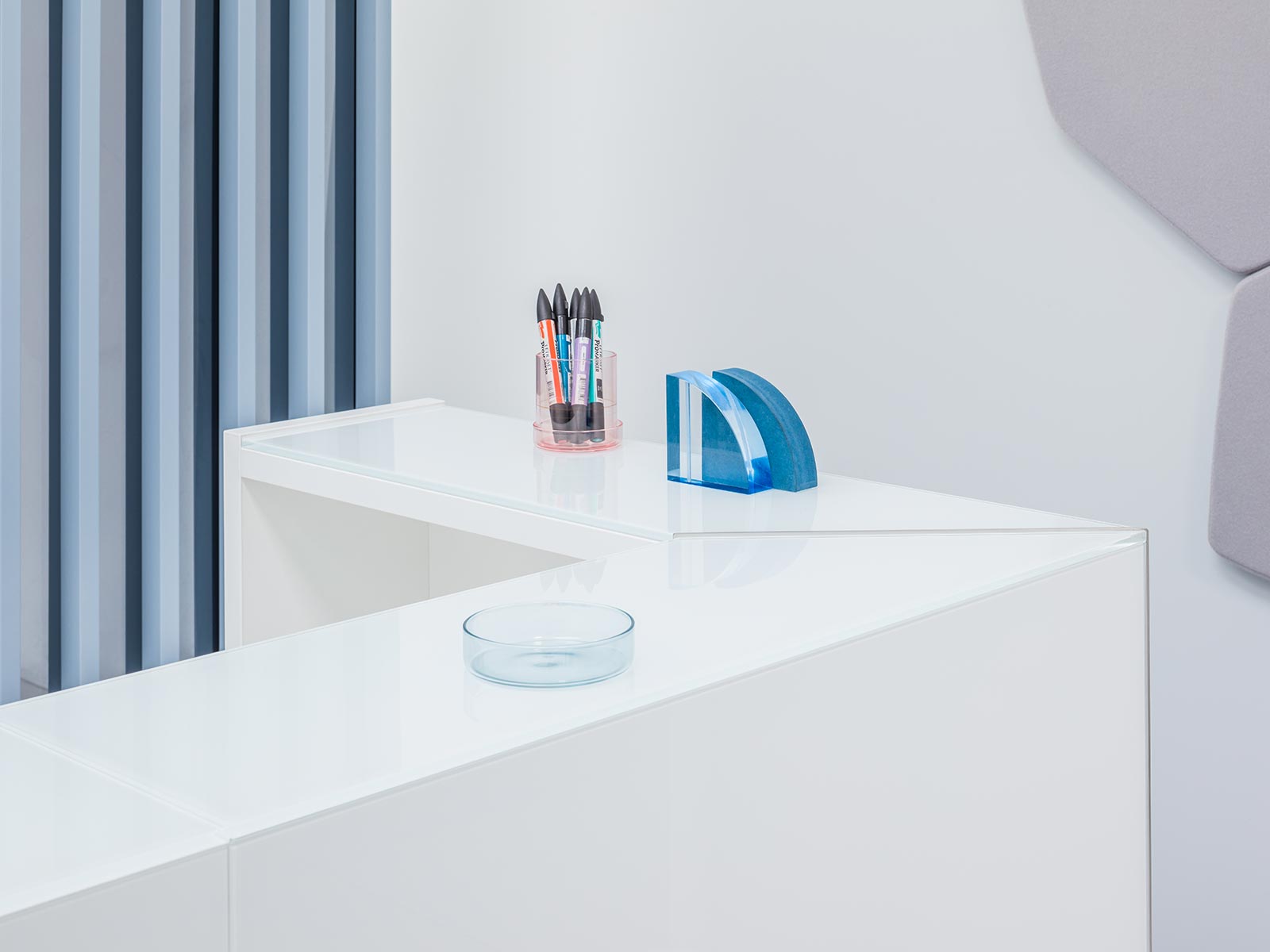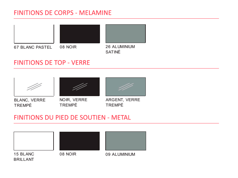 Les visiteurs ont à leur disposition un top en verre d'épaisseur 8 mm qui est assorti à la structure en bois mélaminé. Les finitions disponibles sont les suivantes : blanc, noir et gris.
