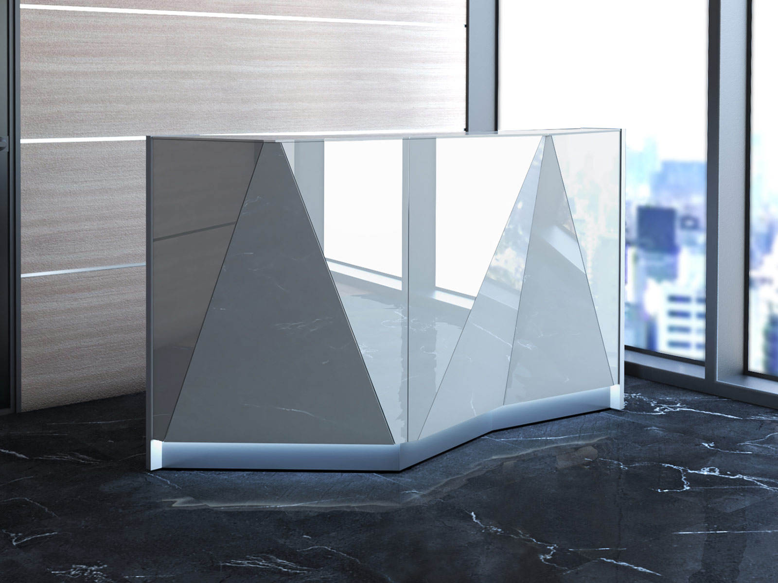 Cette configuration de la banque d’accueil Alpa est proposée ici avec un module légèrement en angle très élégant et compact, mesurant 180 cm cm de longueur totale par 95 cm de profondeur. Équipé d'un passage de câbles intégré, d'une tablette sous le plateau pour y poser un écran et d'un bandeau lumineux en partie basse, Alpa est à la fois design et fonctionnel. Ses multiples façades en verre travaillée en biseaux lui donnent beaucoup d'élégance et d'originalité.