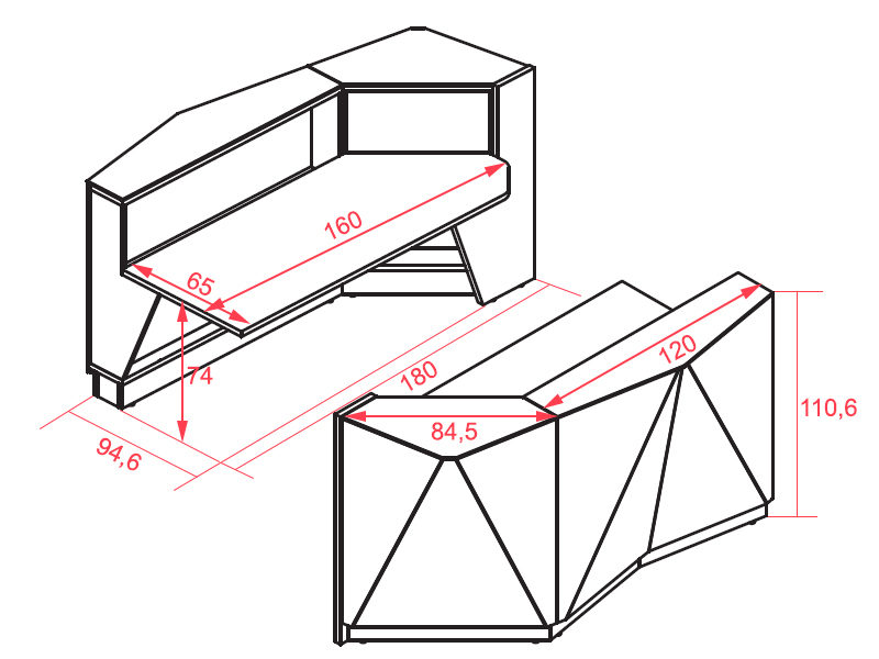 Le comptoir d'Alpa se situe à 110,6 cm de hauteur. Il a un plateau en mélaminé de 28 mm d'épaisseur, 65 cm de profondeur et 160 cm de largeur dans sa partie la plus longue. Il est à 74 cm du sol.