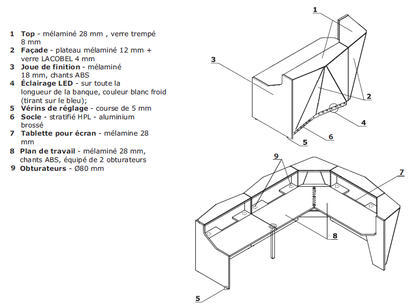 Le bureau est composé de mélaminé 18 mm au niveau de ses joues et de mélaminé 12 mm avec verre LACOBEL 4 mm en façade. Le comptoir est en mélaminé d'épaisseur 28 mm avec revêtement en verre trempé 8 mm pour garantir sa solidité et prévenir de son usure dans le temps.