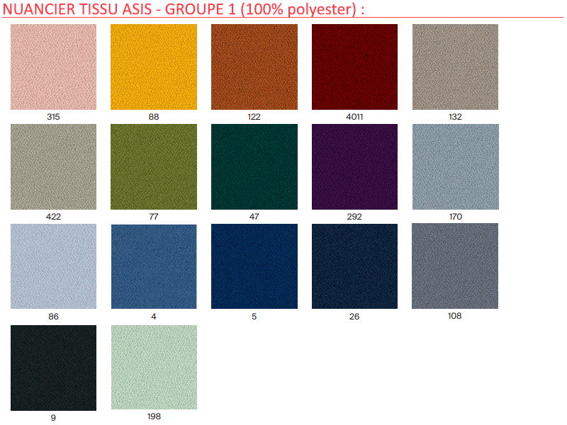 Plania est proposé ici dans le nuancier ASIS composé à 100% de polyester. C'est un nuancier entrée de gamme. Les bancs peuvent être tapissés dans tous les nuanciers Inclass,
